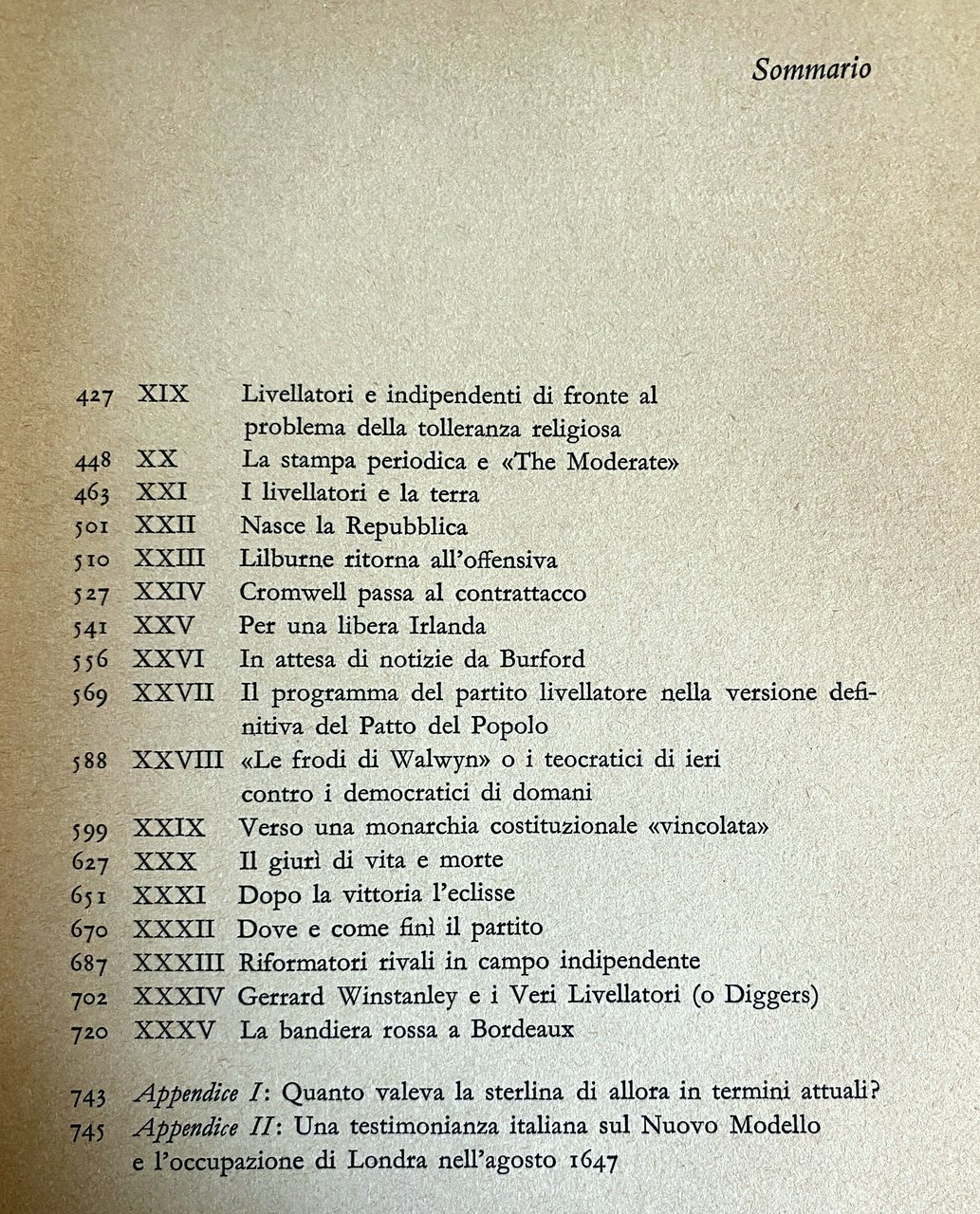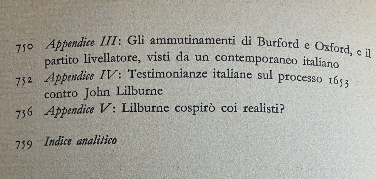 Soggetti: Storia moderna Inghilterra regno Unito Rivoluzione inglese Seicento Politica Guerra civile Guerre Abbott Scritti politici Discorsi Oliver Cromwell Clarke Papers Firth Stato moderno Partiti Rimostranze Ribellioni movimenti Moti Libertà Trattati Diplomazia Costituzione Puritanesimo Puritani Chiesa anglicana Filosofia Pensiero politico Discorsi pubblici Manifestazioni Manifesto Religione Bibliografia Riferimento Studi storici Saggi Consultazione Collezionismo Libri rari fuori catalogo Vintage Declaration Engagements Remonstrances Resolutions Thomas Fairfax General Council Army Haller Davies Tracts Haller Liberty Puritan Revolution Pease Stuart Movement Study History Political Thought Civil War Rushworth Wolfe Manifestoes Woodhouse Being Army Debates Manuscripts Dibattiti Libelli Vittorio Gabrieli Antico Testamento Pulpiti Taverne Apologia presbiteriana Intolleranza religiosa Richard Overton Anabattisti Razionalisti Eresie Anabattismo Eretici William Walwyn Cristianesimo pratico Cattolicesimo Controversie John Lilburne Esercito Nuovo Modello Luogotenente Rivolte Soldati Agitatori Agitazioni Società Pace Londra Patto del Popolo Putney Ammutinamento Ware Riconciliazione Windsor Partito livellatore Battaglie Preston Pride Grande Petizione Rimostranza Appendice Ammutinamenti Burford Oxford Testimonianze italiane Processo Cospirazioni Cospiratori Complotti Realisti Indipendenti Tolleranza Stampa periodica Moderati Terra Contadini Repubblica Irlanda Programma Frodi Walwyn Teocratici Democratici Monarchia costituzionale Giurì Vittoria Riformatori Gerrard Winstanley Diggers Bandiera rossa Bordeaux Sterlina Occupazione Potere Lotta di classe Abolizione Accise Tasse Adulterio Bigamia Bonifica Brughiera Epworth Sovrano re Sovranità Diritto Diritti Parlamento Epurazione Heads of Proposals Fairfax Recinzioni Jubbes Elezioni Munster Eguaglianza Comunitarismo Pamphlet Lotte Amnistia Amsterdam America Allen William Aubrey Artigiani Ateismo Berkeley Bestemmia Bibbia Bray Borghi Blake Camera stellata Brownisti Pascoli Cancelleria Cartisti Chidley Clarendon Clero Coke Purghe Commercio Confische Proprietà Copyholders Trattative Francia Scozia Decime Enclosures Ebrei Eliot Quaccheri Essex Everard Freeholders Fittavoli Germania Graves Harris Harrison Hammond Hamilton Holmby Thomas Hobbes Humble Hume Ireton Joyce Kiffin Laud Leggi Lettere Librai Corporazioni Impeachment Comuni John Locke Locande Taverne Magna Carta Lord Maynard Mercanti Legge marziale Mazarino Matrimonio Milton Utopia More Monk Munzer Areopagitica Divorzio Filosofia Ideologie Peters Hugh Agenti Predicatori Presbiteriani Putney Pym Protestanti Richelieu Squatters Sir Vane Ugonotti Tessitori Voto segreto Veto Suffragio maschile Francis White Yeomen Repubblicanesimo Wildman Autorità Clausola Coscienza Consiglio Contee Corte Edward Sexby Henry Marten Prigionia Indipendenti Giudici Giuria Giustizia Regno Avvocati Leader Mercurio Nazione Opuscoli Orgoglio Purga Prigionieri Protettorato Punizione Rainsborough Riforma Reggimento Rimostranza Santi Scozzesi Soldati Spada Truppe Vittoria Walwyn Westminster Borghesia Bacone Violenza Winstanley Macaria Marxista Proletariato Critica Testi Eduard Bernstein Gloriosa Storiografia Interpretazione Carlyle Liberalismo Winstanley Eletti Settari Restaurazione Interregno Cavalieri Teste rotonde Fianchi di ferro Douglass Ribelli Thomason Godfrey Davies Don Wolfe Woodhouse Whig Pari Nobiltà Squirearchy Coltivatori Modern history England United Kingdom English revolution Seventeenth century Politics Civil Wars Political writings Speeches State Parties Rebellions movements Uprisings Freedom Treaties Diplomacy Constitution Puritanism Puritans Anglican church Philosophy Political thought Public speeches Demonstrations Religion Bibliography Reference Historical studies Essays Consultation Collecting Rare books out of print Debates Pamphlets Old Testament Pulpits Taverns Presbyterian apology Religious intolerance Anabaptists Rationalists Heresies Anabaptism Heretics Practical Christianity Catholicism Controversies Army New Model Lieutenant Revolts Soldiers Agitators Unrest Society Peace London People's Pact Mutiny Reconciliation Party Battles Purge Great Petition Appendix Mutinies Italian testimonies Trial Conspiracies Conspirators Plots Independent royalists Tolerance Periodical press Moderates Land Peasants Republic Ireland Program Fraud Theocrats Democrats Constitutional monarchy Jury Victory Reformers Gerrard Red Flag Pound Occupation Power Class Struggle Abolition Excise Taxes Adultery Bigamy Reclamation Moor Sovereign King Sovereignty Law Rights Parliament Elections Equality Communitarianism Struggles Amnesty Artisans Atheism Blasphemy Bible Villages Star Chamber Pastures Chancellery Chartists Clergy Purges Trade Confiscations Property Negotiations France Scotland Tithes Jews Quakers Tenants Germany Graves Laws Letters Booksellers Corporations Communes Inns Taverns Magna Carta Merchants Martial Law Mazarin Marriage Areopagitic Divorce Philosophy Ideologies Agents Preachers Presbyterians Protestants Huguenots Weavers Secret Vote Manhood Suffrage Republicanism Authority Conscience Clause Council Counties Court Imprisonment Independents Judges Jury Justice Kingdom Lawyers Mercury Nation Pamphlets Pride Prisoners Protectorate Punishment Reform Regiment Scots Soldiers Sword Troops Victory Bourgeoisie Bacon Violence Marxist Proletariat Criticism Texts Glorious Historiography Interpretation Liberalism Elect Saints Sectarians Restoration Interregnum Knights Roundheads Iron Sides Rebels Peers Nobility Farmers