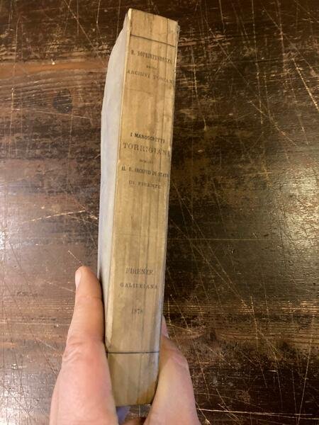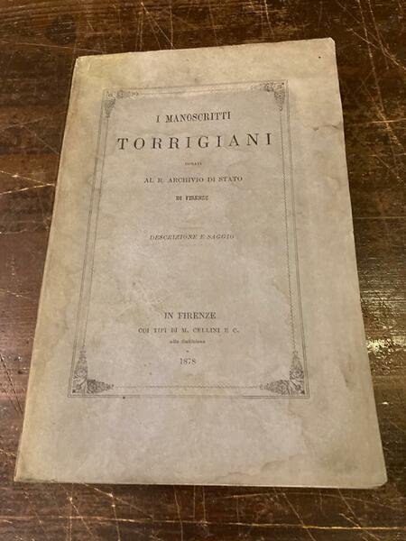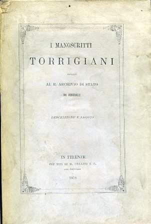 In-8°, pp. XIII, (3), 483, brossura editoriale grigia. Ottimo esemplare. Rara tiratura a parte, impressa in soli cento esemplari, di questa minuziosa descrizione dei manoscritti del fondo Torrigiani dell'Archivio di Stato di Firenze, estratta dall'Archivio Storico Italiano', serie terza, tomo XIX-tomo XXVI, e curata da Cesare Guasti, allora Soprintendente degli Archivi di Stato della Toscana. Nel 1866, in seguito a disposizione testamentaria del marchese Carlo Torrigiani, morto l'anno prima, passarono all'Archivio di Stato di Firenze parecchie pergamene e 6 filze di documenti, oggetto del presente regesto.
