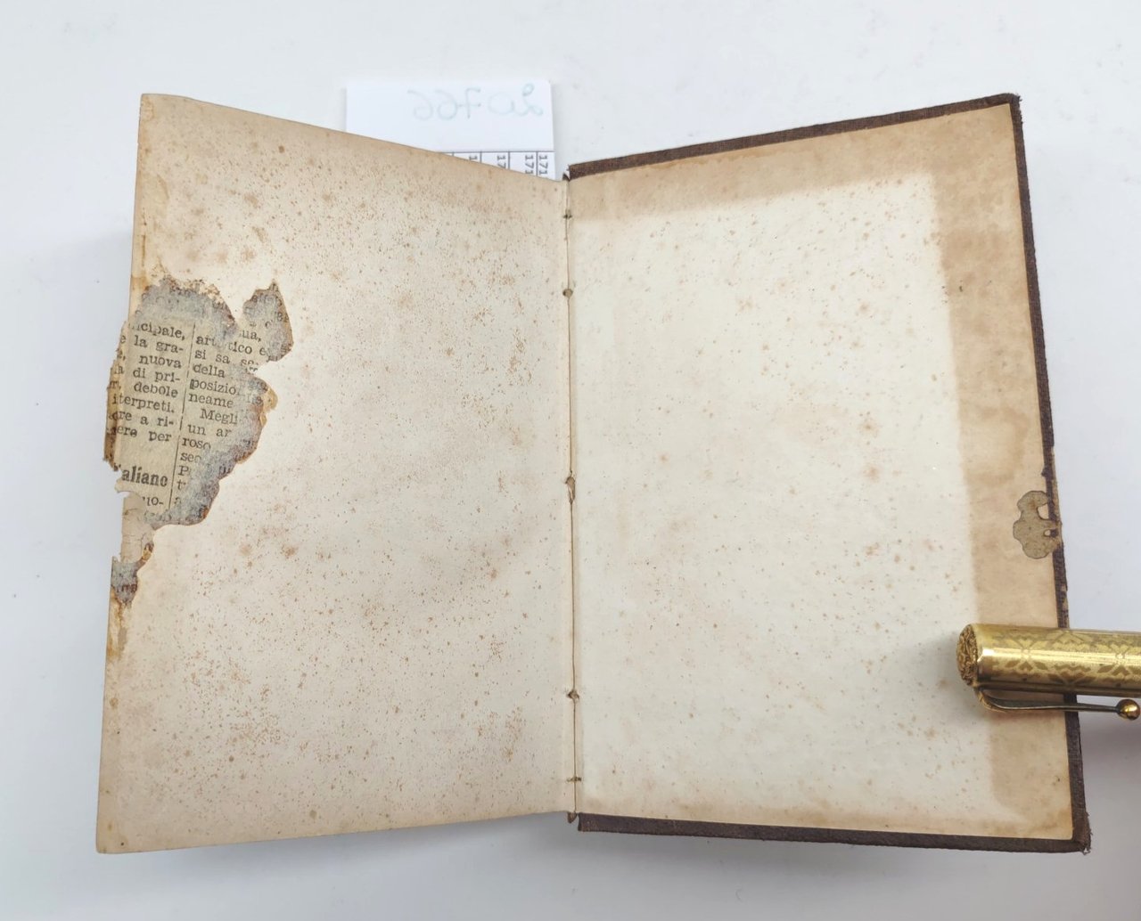 Legatura rigida in tela in condizioni accettabili con segni di usura, piatti color viola e dorso in giallo con piccoli strappi riparati ai margini tra piatti e dorso, alcune mancanze ai margini, tagli bruniti impolverati, fioriture alle pagine interne che non impediscono la lettura, al frontespizio annotazione coeva al margine superiore, alcune sottolineature appena nel testo alle prime 47 pagine, vedere immagini, pagine interne leggermente brunite, ultima pagina bianca con una mancanza al margine esterno e parte di un giornale incollato, vedere immagini, numero pagine 456 dimensioni cm 15 * 10,2 * 2,4