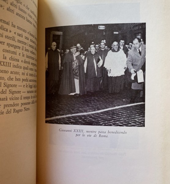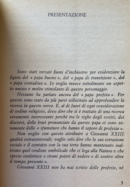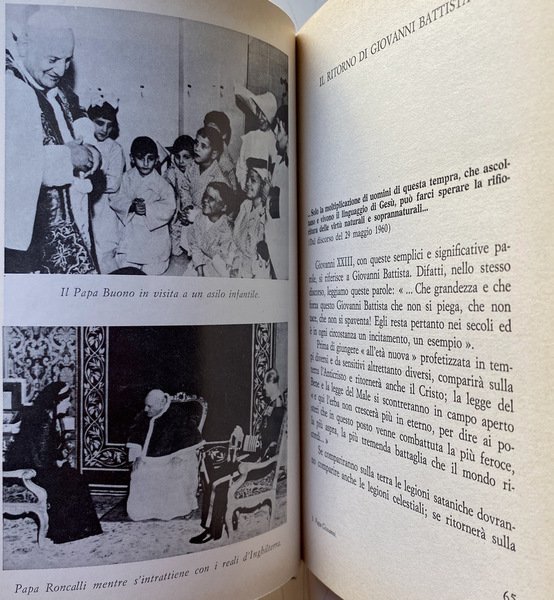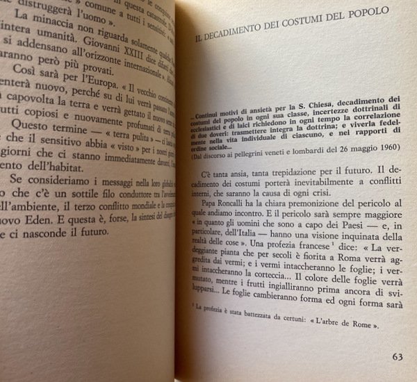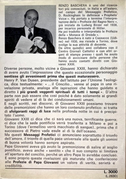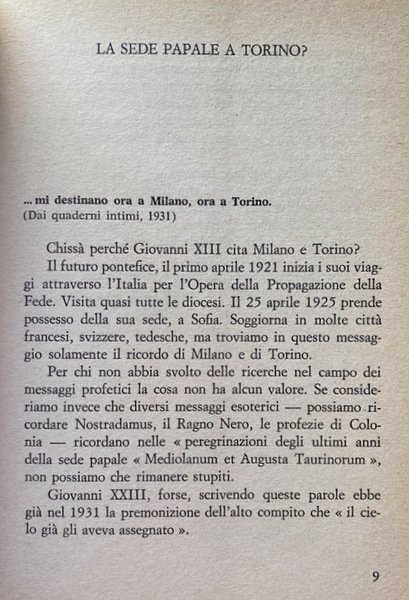D'altra parte non può essere che così poiché è dato solamente ai grandi spiriti di vedere al di là dei condizionamenti umani. E negli scritti, nei discorsi, di Giovanni XXIII possiamo trovare delle premonizioni che hanno un loro contenuto profetico: si tratta di sfolgoranti raggi di luce nella profonda notte in cui è precipitato l'uomo. Giovanni XXIII ci dice che ci sarà una nuova, terrificante guerra; ci dice che la sede pontificia verrà trasferita a Milano e poi a Torino (dove l'ermellino verrà macchiato di sangue), prima che il successore di Pietro vada esule al di là dell'oceano.