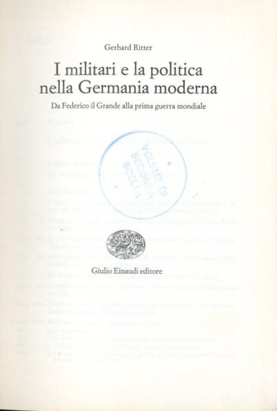 XVII, 707 p. ; 22 x 15 cm. Biblioteca di cultura storica. Titolo originale dell'opera: Staatskunst und Kriegshandwerk: Das Problem des «Militarismus» in Deutschland. Traduzione di Giuseppina Panzieri Saija. Legatura editoriale con coperta rigida in tela verde, titolo impresso in bianco al dorso, muto il piatto, manca la sovraccoperta editoriale, la coperta mostra segni del tempo e alcune macchie di umidità, nel frontespizio timbro editoriale di "volume di seconda scelta", le pagine interne sono in ottimo stato. Codice libreria 1134.