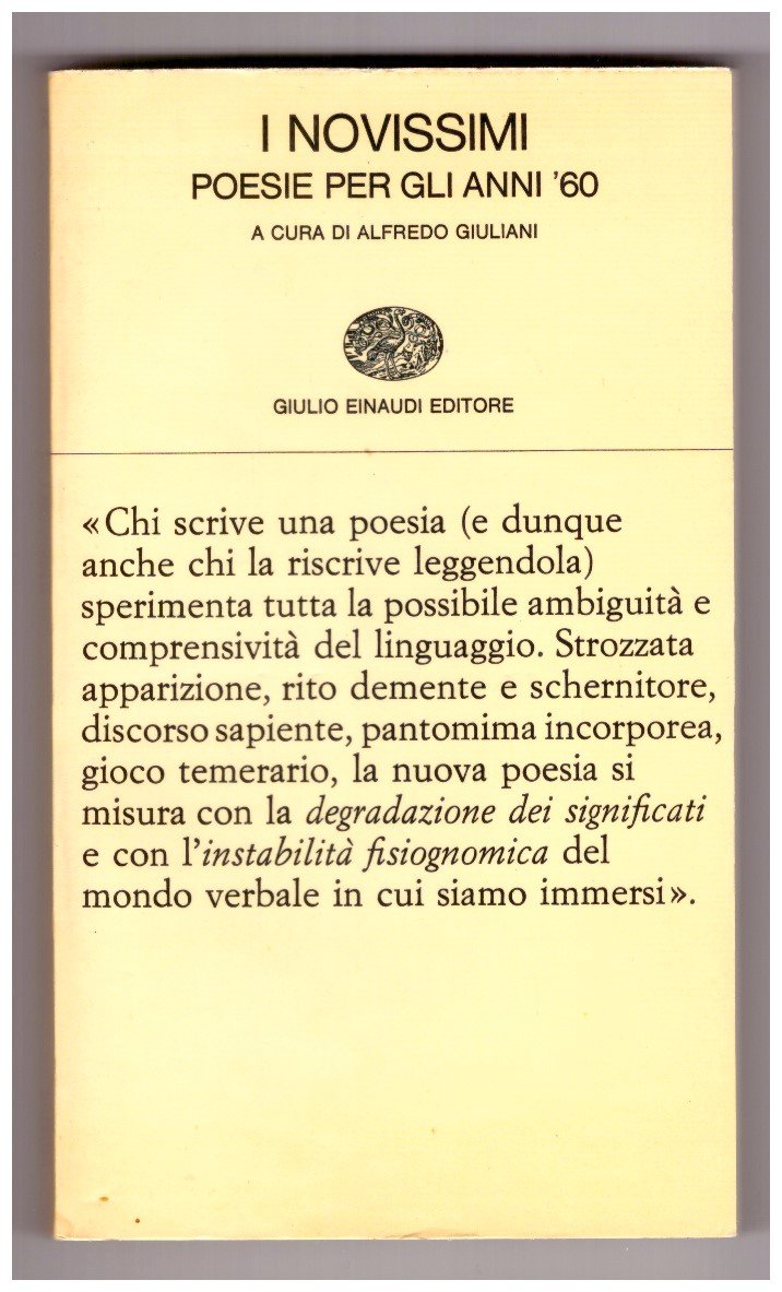 Collana “Collezione di Poesia”, 19. Un volume di 233 pagine, brossura editoriale. Dimensioni: 10,5x18 cm. Brossura ingiallita e con qualche traccia d’uso; firma di possesso alla pagina di titolo, per il resto interno in ottime condizioni.