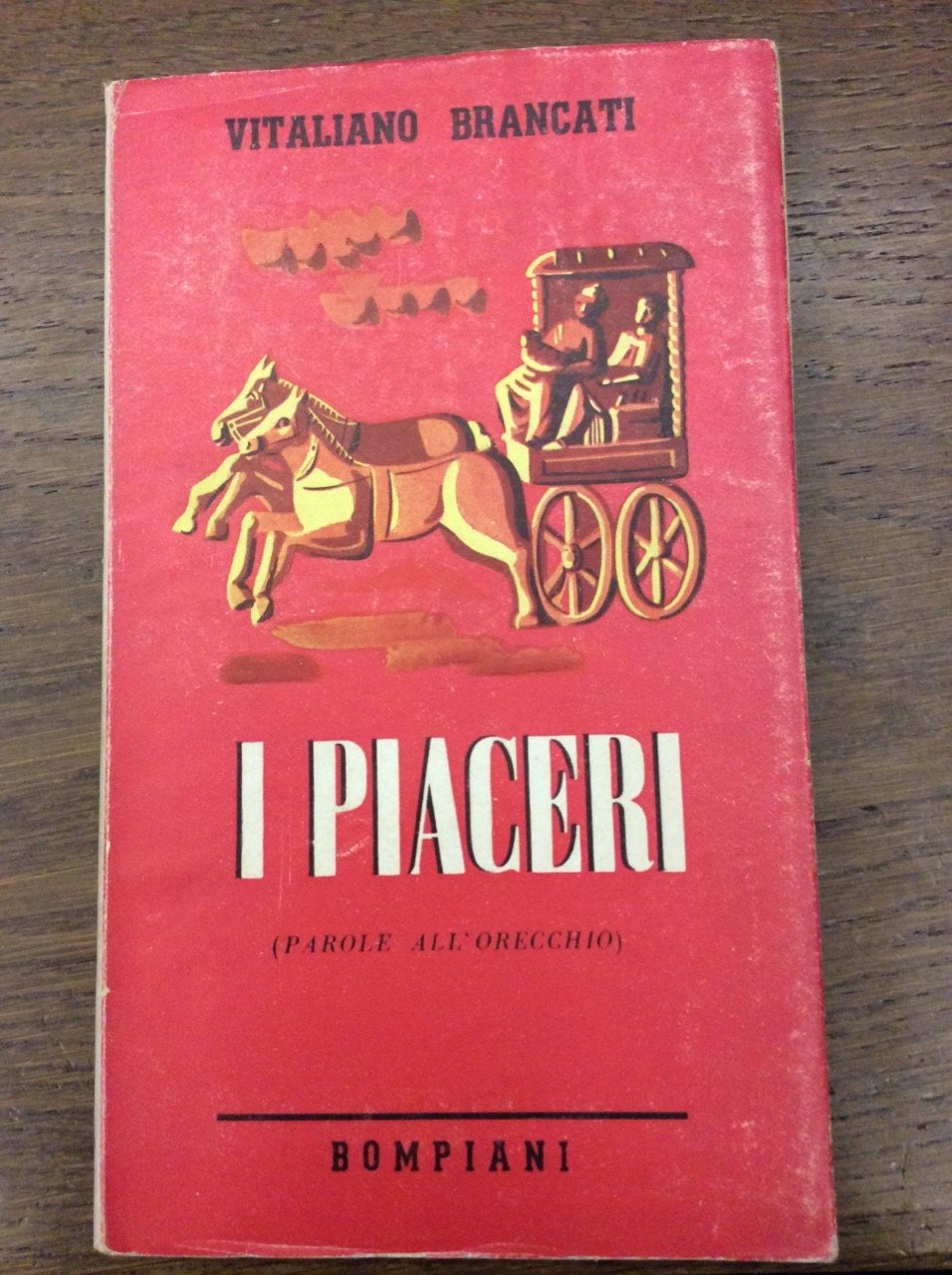 In-8 p., brossura orig. con un disegno al tratto, sovracoperta, pp. 148,(9). "Prima edizione". Cfr. Gambetti / Vezzosi, p. 133. Dodici piaceri' in gran parte apparsi su "Omnibus" e su altri periodici, 1938-1943. Abbastanza ricercato. Ben conservato.