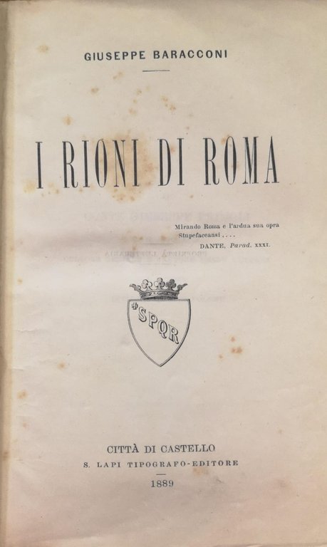 In-8 p., mz. pelle coeva (piccole mancanze e lievi segni duso), fregi e titolo (in tassello) oro al dorso, pp. 718, con unincisione in bianco e nero per ogni rione. Storia di Roma rione per rione.Esemplare con fioriture, peraltro in buone condizioni.
