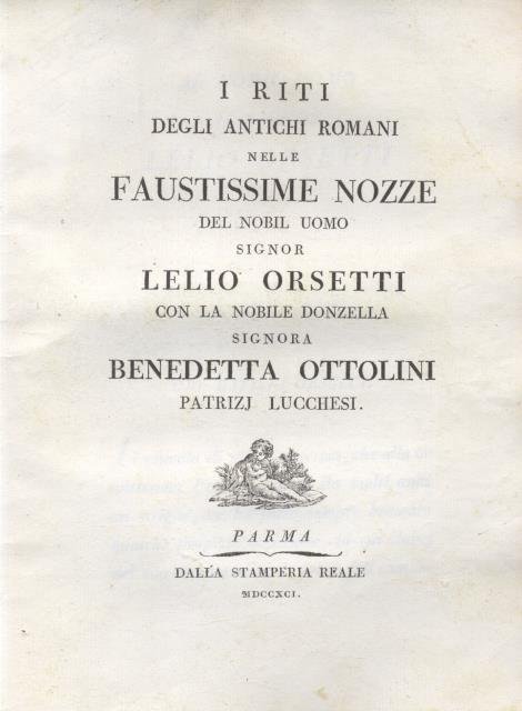 I RITI DEGLI ANTICHI ROMANI. Nelle faustissime Nozze del Nobil Uomo Signor Lelio Orsetti con la Nobil Donzella Signora Benedetta Ottolini Patrizj Lucchesi.