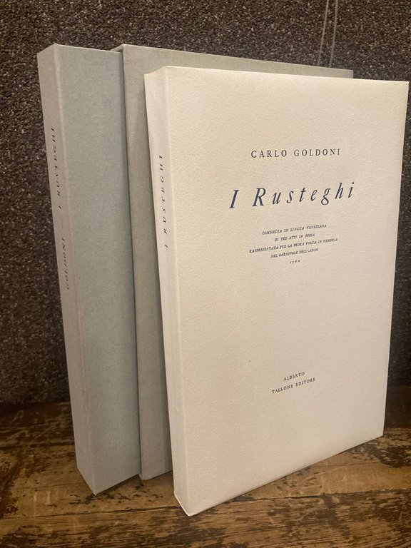 In-4° (26x17 cm), pp. 174, (10), brossura editoriale incamiciata con titoli in nero al dorso e al piatto anteriore, cartella e custodia editoriali in cartone rigido azzurro. Ottimo esemplare (dei 220 su velina crème). Edizione talloniana a cura di Antonio Cibotto in occasione del Bicentenario Goldoniano (1783-1993). Spiegazione dei termini veneziani.