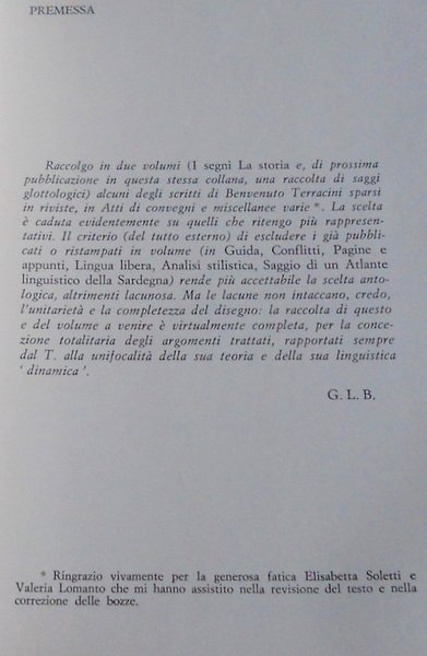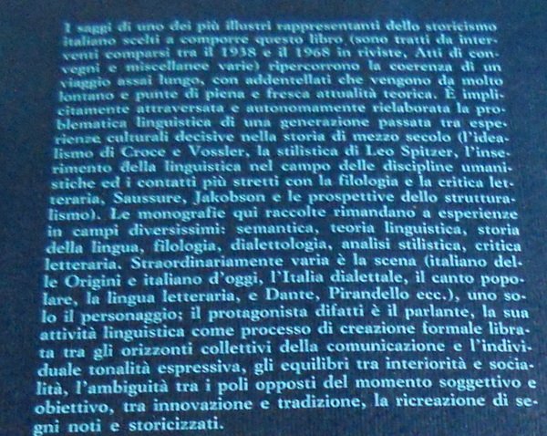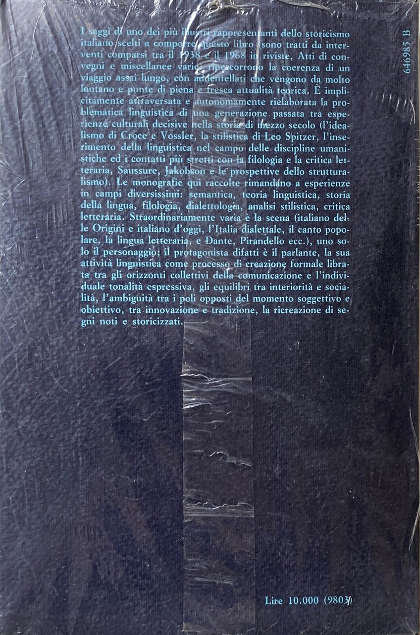 I saggi di uno dei più illustri rappresentanti dello storicismo italiano scelti a comporre questo libro (sono tratti da interventi comparsi tra il 1938 e il 1968 in riviste, Atti di convegni e miscellanee varie) ripercorrono la coerenza di un viaggio assai lungo, con addentellati che vengono da molto lontano e punte di piena e fresca attualità teorica. E implicitamente attraversata e autonomamente rielaborata la problematica linguistica di una generazione passata tra esperienze culturali decisive nella storia di mezzo secolo (l'idealismo di Croce e Vossler, la stilistica di Leo Spitzer, l'inserimento della linguistica nel campo delle discipline umanistiche ed i contatti più stretti con la filologia e la critica letteraria, Saussure, Jakobson e le prospettive dello strutturalismo). Le monografie qui raccolte rimandano a esperienze in campi diversissimi: semantica, teoria linguistica, storia della lingua, filologia, dialettologia, analisi stilistica, critica letteraria. Straordinariamente varia è la scena (italiano delle Origini e italiano d'oggi, l'Italia dialettale, il canto popolare, la lingua letteraria, e Dante, Pirandello ecc.), uno solo il personaggio; il protagonista difatti è il parlante, la sua attività linguistica come processo di creazione formale librata tra gli orizzonti collettivi della comunicazione e l'individuale tonalità espressiva, gli equilibri tra interiorità e socialità, l'ambiguità tra i poli opposti del momento soggettivo e obiettivo, tra innovazione e tradizione, la ricreazione di segni noti e storicizzati.