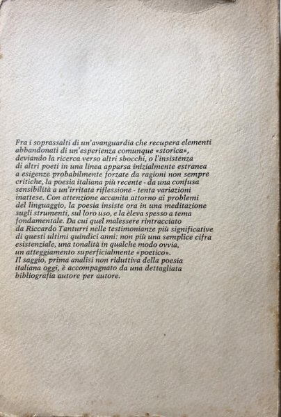 Soggetti: Poesia italiana, Poeti italiani del Novecento, Poetica, Letteratura, Studi culturali, Stili e correnti letterarie, Rime, Versi, Critica letteraria, Saggistica, Libri Vintage, Fuori catalogo, Studi novecenteschi, Avanguardia e neo-avanguardia, Realismo, Simbolismo, Neo-Ermetismo, Cultura, Gruppo 63, Opere generali, Poesia tecnologica, Filosofia, MacLuhan, Marshall, Marcuse, Influenze culturali, Psicanalisi, Barthes, Lacan, Foucault, Levy-Strauss, Strutturalismo, Robbe-Grillet, Butor, Sarraute, Le Clézio, Scuola di Francoforte, Progresso, Ideologie politiche, Marxismo, Anni Cinquanta, Anni Sessanta, Anni Settanta, Bibliografia, Linguaggio, Anceschi, Accrocca, Barberi Squarotti, Balestrini, Bevilacqua, Bigongiari, Brecht, Caproni, Cataffi, Ceronetti, Cataffi, Curci, Fortini, Eco, Finzi, Fabiani, Grillandi, Dego, Kavafis, Landi, Husserl, Guidacci, Manacorda, Eugenio Montale, Mario Luzi, Maiorino, Majakovskij, Moretti, Moravia, Marinotti, Orsini, Nogara, Papini, Palazzeschi, Pier Paolo Pasolini, Piancastelli, Paglierini, Porta, Pound, Quasimodo, Perronchi, Penna, Pennati, Raboni, Ramat, Ripellino, Arte, Dialettale, Roversi, Rosselli, Sanguineti, Sereni, Simonotti, Saussure, Spaziani, Testori, Teilhard De Chardin, Uffredduzzi, Ungaretti, Valeri, Zanzotto, Zavattini, Vittorini, Volponi, Zolla, Xerra, Orengo, Morante, Fermento, Angoscia, Lirica, Gruppo 47, Alberto Arbasino, Luciano Anceschi, Scheiwiller, Poesia novissima, De-narratori, Mallarmé, Rimbaud, Verlaine, Paul Valéry, Alfonso Gatto, Gozzano, Poesia visiva, Dopoguerra, Militanti, Politica, Eclettismo, Officina, Sperimentalismo, Dadaismo, Comunicazione di massa, Contestazione, Jacques Derrida, Emilio Isgrò, Napoli, Democratizzazione, Ermeneutica, Italian Poetry, Italian Poets of the Twentieth Century, Poetics, Literature, Cultural Studies, Literary Styles and Currents, Rhymes, Verses, Literary Criticism, Essay, Books Out of Print, Twentieth Century Studies, Neo-Avant-garde, Realism, Symbolism, Neo-Hermeticism, Culture, Group 63, General Works, Technological Poetry, Philosophy, Cultural Influences, Psychoanalysis, Frankfurt School, Progress, Political Ideologies, Fifties, Sixties, Seventies, Bibliography, Language, Dialect, Anguish, Lyric, Novissima Poetry , De-narrators, Visual Poetry, Post-war, Militants, Politics, Eclecticism, Workshop, Experimentalism, Dadaism, Mass Communication, Dispute, Naples, Democratization, Hermeneutics, Tre casi di poesia, Indagini e prospettive