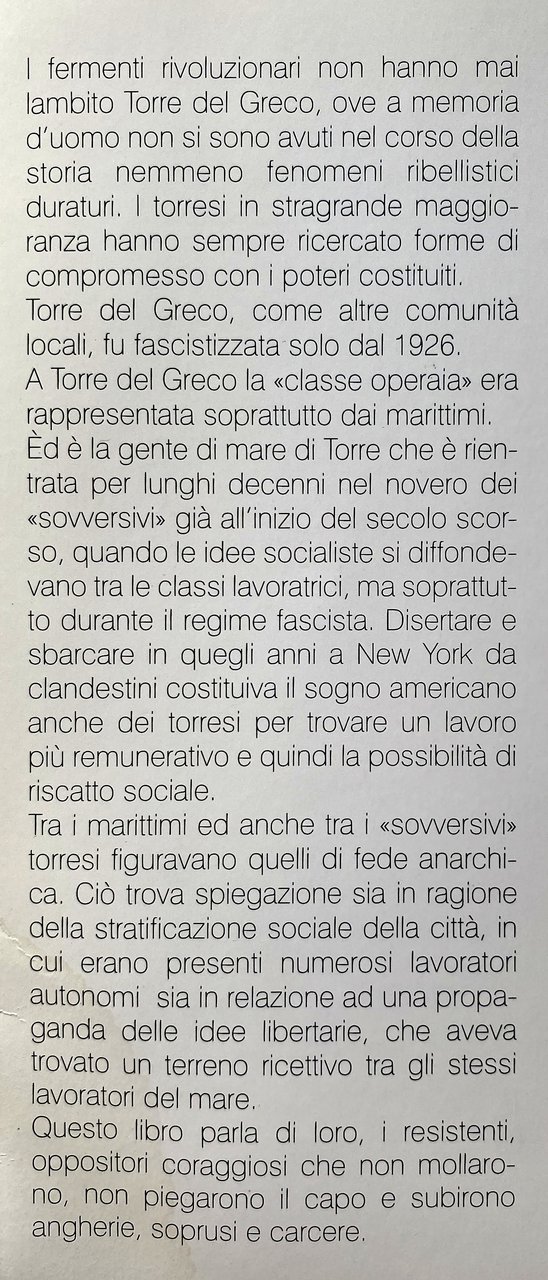 I fermenti rivoluzionari non hanno mai lambito Torre del Greco, ove a memoria d'uomo non si sono avuti nel corso della storia nemmeno fenomeni ribellistici duraturi. I torresi in stragrande maggioranza hanno sempre ricercato forme di compromesso con i poteri costituiti. Torre del Greco, come altre comunità locali, fu fascistizzata solo dal 1926.A Torre del Greco la classe operaia era rappresentata soprattutto dai marittimi. Ed è la gente di mare di Torre che è rientrata per lunghi decenni nel novero dei sovversivi già all'inizio del secolo scorso, quando le idee socialiste si diffondevano tra le classi lavoratrici, ma soprattutto durante il regime fascista. Disertare e sbarcare in quegli anni a New York da clandestini costituiva il sogno americano anche dei torresi per trovare un lavoro più remunerativo e quindi la possibilità di riscatto sociale. Tra i marittimi ed anche tra i «sovversivi» torresi figuravano quelli di fede anarchica. Ciò trova spiegazione sia in ragione della stratificazione sociale della città, in cui erano presenti numerosi lavoratori autonomi sia in relazione ad una propaganda delle idee libertarie, che aveva trovato un terreno ricettivo tra gli stessi lavoratori del mare. Questo libro parla di loro, i resistenti, oppositori coraggiosi che non mollarono, non piegarono il capo e subirono angherie, soprusi e carcere.