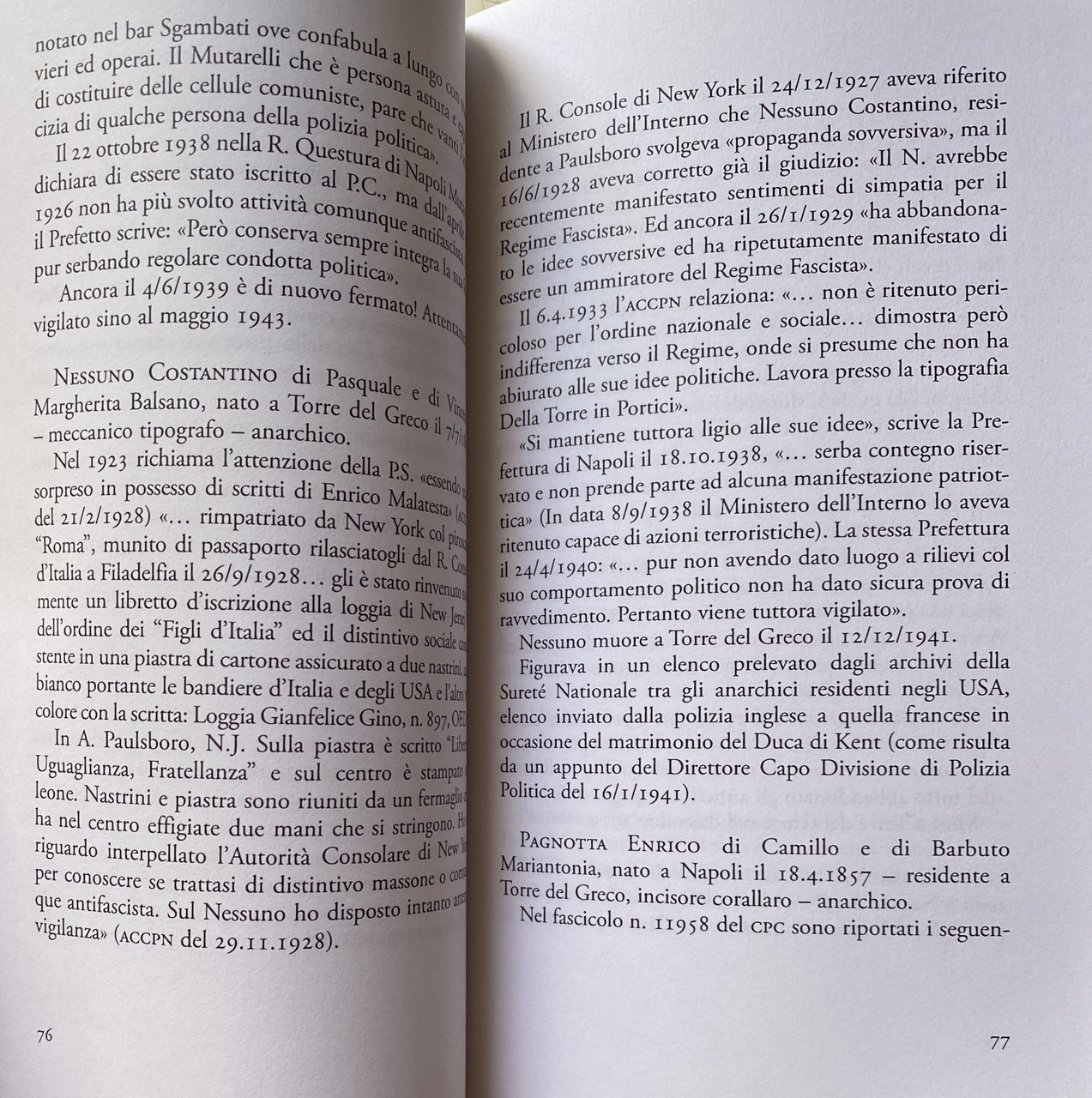 Soggetti: Storia locale, Torre del greco, Torresi, Antifascismo, Resistenza, Sovversivi, Napoli, Casellario Politico Centrale, Elenchi, Nomi, Comunismo, Socialismo, Anarchismo, Opposizione, Sovversione, Comunisti, Anarchici, Antifascisti, Oppositori, Dissidenti, Polizia, Schedati, Regime fascista, Marittimi, Lavoratori, Partigiani, Seconda Guerra Mondiale, Rivoluzionari, Rivoluzione, Libri rari Vintage fuori catalogo, Collezionismo, Saggi politici, Politica, Società, Provincia, Libertarismo, Potere, Anni Venti, Anni Trenta, Anni Quaranta, Biografie, Memorie, Documenti, Radiati, Luigi Palomba, Famiglie, Genealogia, Corallo, Corallari, Cammei, Orafi, Pescatori, Artigianato, Commercio, Torre Annunziata, Campania, Emigranti, Clandestinità, America, Consenso, Uomo qualunque, Guglielmo Giannini, Monarchici, Democrazia Cristiana, Miseria, Archivio, Benessere, Generazioni, Acquaviva, Amaturo, Articolo, Di Cristo, Esposito, Facciolla, Formisano, Frappoli, Cimino, Castagna, Coppola, De Luca, Di Blasio, Galiano, Gagliardi, Galiano, Lopez, Panariello, Penniello, Pantaleo, Romano, Russo, Scarano, Scognamiglio, Spagnuolo, Spina, Vitiello, Giuseppe Giulietti, Federazione, Difesa, Fabbriche, Di Vito, Ascione, Izzo, Gaudino, Cirillo, De Martino, Della Gatta, Castellano, Manna, Mennella, Nessuno, Pagnotta, Palomba, Rivieccio, Sportiello, Sorrentino, Vitiello, Tortora, Murino, Matteotti, Sacco e Vanzetti, Attività sovversive, Sospetti, Disertori, Giorgio Fabre, Inchieste, Reportage, Benito Mussolini, Perquisizioni, Di Donna, Benedeuce, Elezioni, Avanguardia, Enrico Malatesta, Questura, Sindacato, Balilla, Condotta, Chicche librarie, Curiosità, Localistica, Italia del Sud, Local history, Antifascism, Resistance, Subversives, Naples, Central Political Records, Lists, Names, Communism, Socialism, Anarchism, Opposition, Subversion, Communists, Anarchists, Antifascists, Opponents, Dissidents, Police, Registered, Regime fascist, Maritime, Workers, Partisans, Second World War, Revolutionaries, Revolution, Rare books out of print, Collectibles, Political essays, Politics, Society, Province, Libertarianism, Power, Twenties, Thirties, Forties, Biographies, Memoirs, Documents, Families, Genealogy, Coral, Cameos, Goldsmiths, Fishermen, Craftsmanship, Commerce, Emigrants, Clandestine, Consensus, Everyman, Monarchists, Christian Democracy, Poverty, Archive, Wellbeing, Generations, Federation, Defense, Factories, Activities subversives, Suspects, Deserters, Investigations, Searches, Elections, Avant-garde, Police Headquarters, Syndicate, Conduct, Book gems, Curiosities, Localistics, Southern Italy