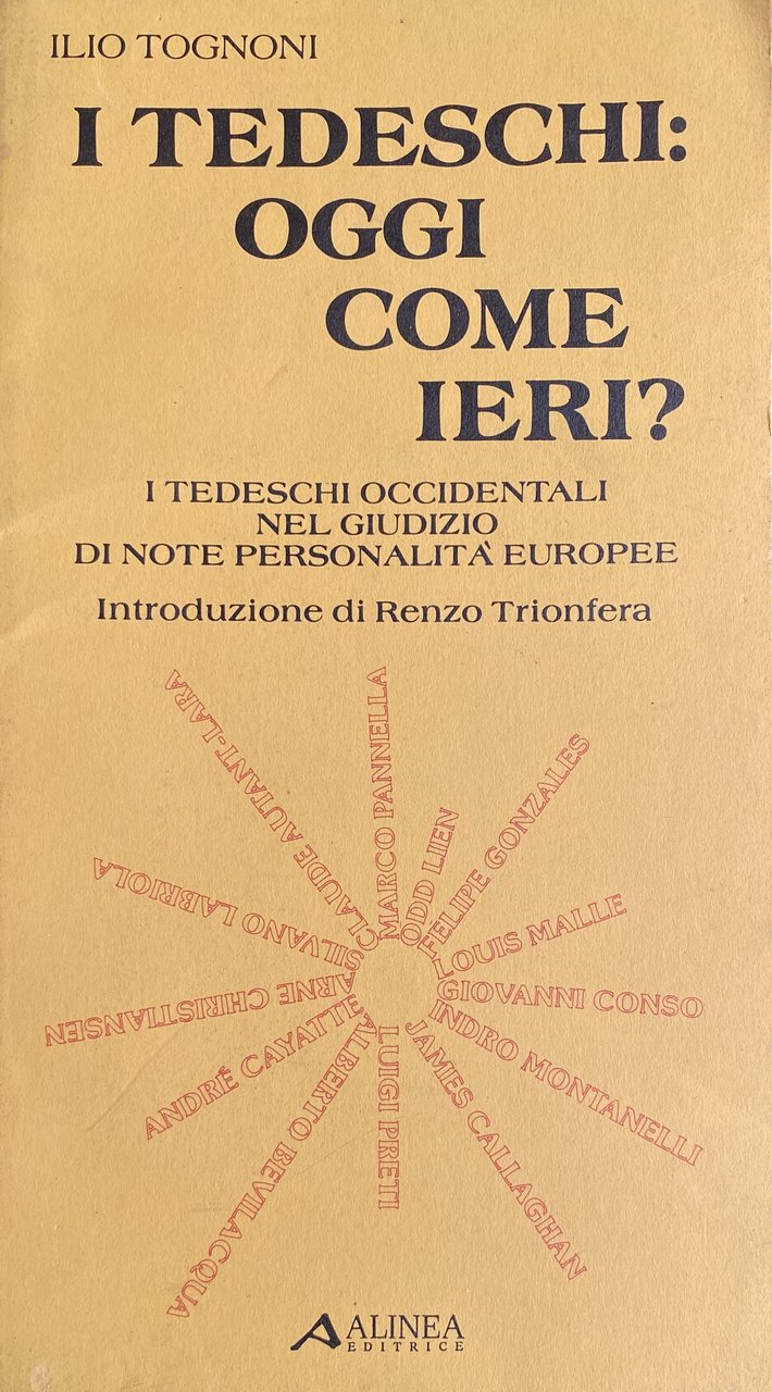 Soggetti: Politologia Germanistica Politica Interviste Germania Governo Opinione pubblica estera Blickpunkt Deutschland-Italien Diplomatischen Beziehungenbooks Politik Zeugenschaft Kritik Wissenspraxis Giornalismo Mass Media Uomini illustri Opinioni Inchieste Collezionismo Libri rari Vintage fuori catalogo Anni Settanta Ottanta Giudizio Diplomazia Cultura Mentalità Società Attualità Pensiero Critica Europa Stati Federalismo Economia Guerra Dreissig Jahre Danach Comunismo Ideologi politiche Unione Sovietica Socialismo Welfare Socialdemocrazia Cambiamento Lavoratori Binoche Cittadini Stranieri Ministri Domande Risposte Francia Ospitalità Generazione Storia Odio Hitler Ebrei Antisemitismo Shoah Colpa Industria Internazionale Italia Conflitti Guerre Lavoro Manovra Membri Nazioni Trattati Norvegia Partiti politici Personalità Divisione Tendenza Tradizioni Stati Uniti Regno Unito Occidentale Italienische Deicidio Borghesia Debré Bismark Almirante Msi Renato Altissimo Claude Autant-Lara Registi Alberto Bevilacqua Scrittori Peter Blaker Manlio Brosio Nato Hector A. De Bruyne Liberale Antony Buck Conservatori Camera Comuni Lasse Budtz Robert Burgolin Andre Cayatte James Callaghan Arne Christiansen Consiglio Giovanni Conso Giudici De Rosa-diaz Reduci Sergio Segre Affari Internazionali Renee Short Laburista Jacques Soustelle Assemblea Riformatori Michael Stewart Giorgio Strelher Teatro Giornalisti Paul Valentin Università Giuseppe Vedovato Democrazia Cristiana Lina Wertmuller Cinema Lord Wallace Of Coslany Jean-Pierre Cot Jean-Marie Daillet Andre Dequae Jean Duvignaud John Ellison Daily Express Raymond Fletcher Marie-therese Godinache-lambert Senatori Felipe Gonzales Alfonso Guerre Segretario Stampa Propaganda Darling Of Hillsborough Deputati Paula del Consil Erik Holst Danimarca Pasteur Elio Petri L. D. H. Aviazione Gran Bretagna Pontillon Silvano Labriola Pat Latham Redattori Birmingham Post Luigi Preti Finanze Scienziati Pierre Lavigne Odd Lien Louis Malle Mallet Rettore Sorbona Menard Eugenio Montale Premio Nobel Letteratura Indro Montanelli Edmund Nessler Democratici Repubblica Flavio Orlandi Marco Pannella Partito Radicale Jim Paterson Riunificazione Immigrazione Accoglienza Arte Nemici Est Francesi Danesi Inglesi italiani Berlino Muro Primavera Praga Ungheria Carrarmati Polizia Stasi Povertà Ricchezza Reddito Solidarnos Movimento operaio Terrorismo Contestazione Anni di Piombo Brigate Rosse Lotta armata Liberismo Privatizzazioni Unità Realismo Inflazione Capitalismo Pacifismo Classe dirigente Esterofobia Nazionalismo Revanscismo Autoritarismo Kesserling Mussolini Goethe Fascismo Nazismo Razzismo Sfruttamento German Political Science Politics Interviews Germany Government Foreign Public Opinion Journalism Famous People Opinions Investigations Collecting Rare Books Out of Print Seventies Eighties Judgement Diplomacy Culture Mentality Society Current Events Thought Criticism Europe Federalism Economy War Communism Ideologists Soviet Union Socialism Social Democracy Change Workers Citizens Foreigners Ministers Questions Answers France Hospitality Generation History Hatred Jews Anti-Semitism Guilt Industry International Italy Conflicts Wars Work Manoeuvre Members Nations Treaties Norway Parties Personalities Division Tendency Traditions United States Kingdom Western Deicide Bourgeoisie Directors Writers Conservatives Chamber Commons Council Affairs Assembly Reformers Theatre Journalists University Christian Senators Secretary Press Deputies Denmark Aviation Great Britain Editors Finance Scientists Sorbonne Nobel Prize Literature Democrats Republic Reunification Immigration Reception Enemies East French Danes English Italians Berlin Wall Spring Prague Hungary Tanks Police Poverty Wealth Income Workers' movement Terrorism Contestation Years Lead Red Brigades Armed struggle Liberalism Privatizations Unity Realism Inflation Capitalism Pacifism Ruling class Esterophobia Nationalism Revanchism Authoritarianism Fascism Nazism Racism Exploitation
