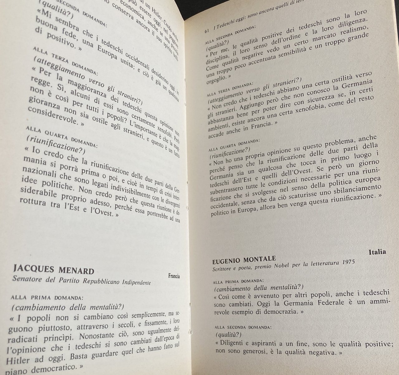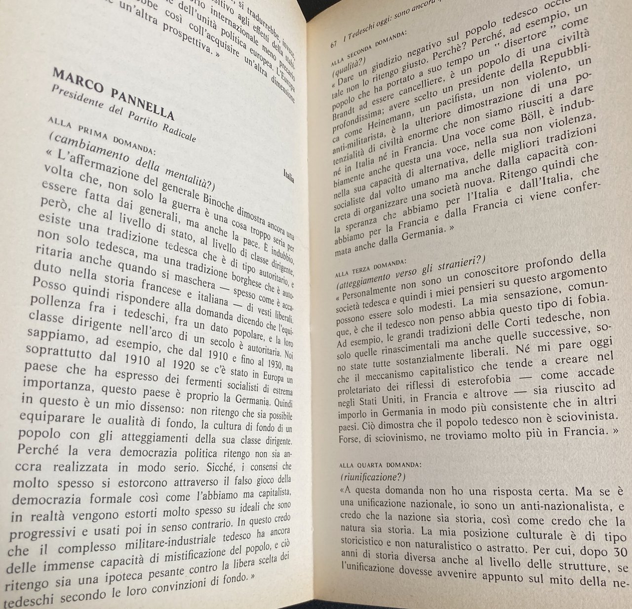 - Politologia, Germanistica, Interviste, Germania, Governo, Opinione pubblica, Politica estera, Deutschland, Italien, Politik, Kritik, Mass Media, Uomini illustri, Opinioni, Inchieste, Collezionismo, Libri rari, Libri Vintage, Libri fuori catalogo, Anni Settanta, Anni Ottanta, Diplomazia, Mentalità, Società, Attualità, Pensiero politico, Critica, Europa, Stati, Federalismo, Economia, Guerra, Comunismo, Ideologie politiche, Socialismo, Welfare, Socialdemocrazia, Lavoratori, Cittadini Stranieri, Ministri, Domande, Risposte, Ospitalità, Antisemitismo, Shoah, Colpa, Industria, Conflitti, Guerre, Nazioni, Partiti politici, Divisione, Tradizioni culturali, Deicidio, Borghesia