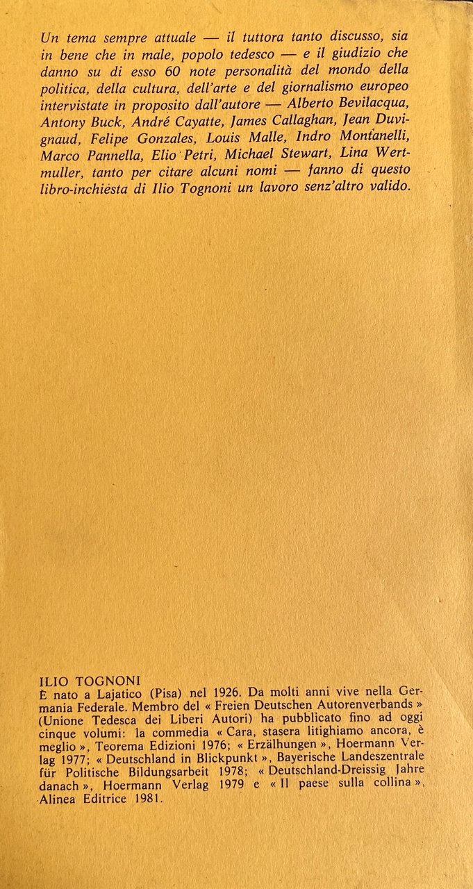 Un tema sempre attuale il tuttora tanto discusso, sia in bene che in male, popolo tedesco e il giudizio che danno su di esso 60 note personalità del mondo della politica, della cultura, dell'arte e del giornalismo europeo intervistate in proposito dall'autore, Alberto Bevilacqua, Antony Buck, André Cayatte, James Callaghan, Jean Duvignaud, Felipe Gonzales, Louis Malle, Indro Montanelli, Marco Pannella, Elio Petri, Michael Stewart, Lina Wertmuller, tanto per citare alcuni nomi, fanno di questo libro-inchiesta di Ilio Tognoni un lavoro senz'altro valido.