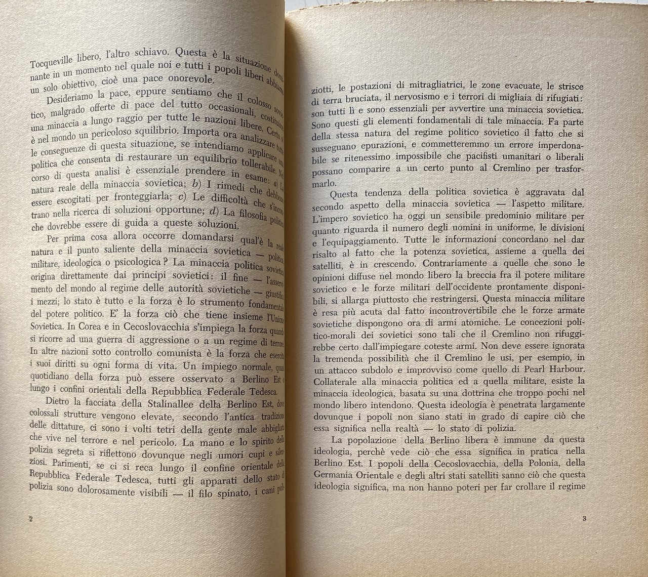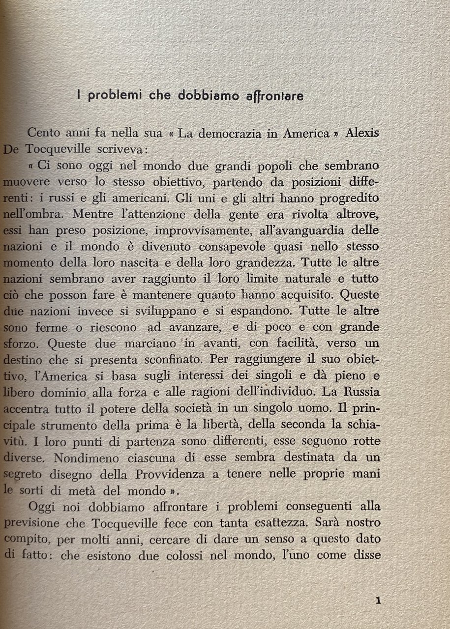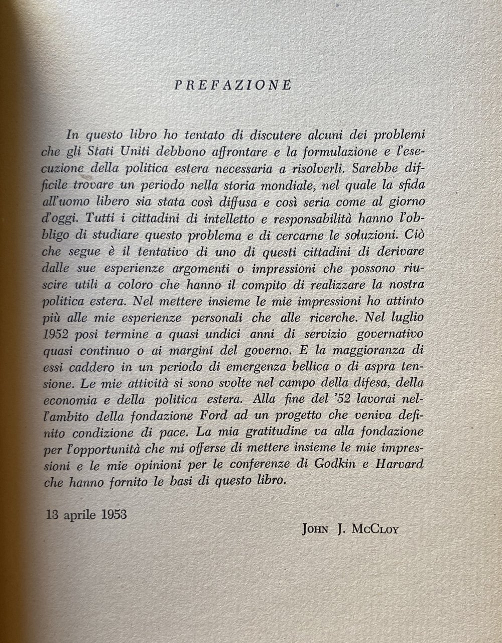 PREFAZIONE. In questo libro ho tentato di discutere alcuni dei problemi che gli Stati Uniti debbono affrontare e la formulazione e l'esecuzione della politica estera necessaria a risolverli. Sarebbe difficile trovare un periodo nella storia mondiale, nel quale la sfida all'uomo libero sia stata così diffusa e così seria come al giorno d'oggi. Tutti i cittadini di intelletto e responsabilità hanno l'obbligo di studiare questo problema e di cercarne le soluzioni. Ciò che segue è il tentativo di uno di questi cittadini di derivare dalle sue esperienze argomenti o impressioni che possono riuscire utili a coloro che hanno il compito di realizzare la nostra politica estera. Nel mettere insieme le mie impressioni ho attinto più alle mie esperienze personali che alle ricerche. Nel luglio 1952 posi termine a quasi undici anni di servizio governativo quasi continuo o ai margini del governo. E la maggioranza di essi caddero in un periodo di emergenza bellica o di aspra tensione. Le mie attività si sono svolte nel campo della difesa, della economia e della politica estera. Alla fine del '52 lavorai nell'ambito della fondazione Ford ad un progetto che veniva definito condizione di pace. La mia gratitudine va alla fondazione per l'opportunità che mi offerse di mettere insieme le mie impressioni e le mie opinioni per le conferenze di Edwin Godkin e Harvard che hanno fornito le basi di questo libro. 13 aprile 1953