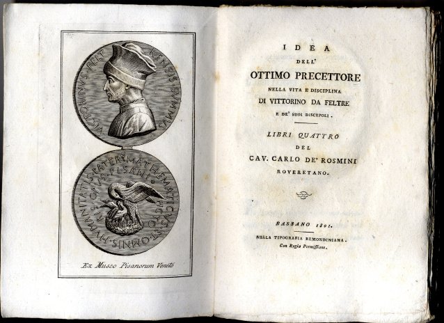 >In-8, pp. 487 brochure coeva in carta decorata, tassello manoscritto al dorso. Antiporta inciso raffigurante una medaglia con l'effige di Vittorino da Feltre. Opera che ripercorre la vita del celebre umanista e professore, esplicando i suoi metodi educativi ed esponendo anche le biografie dei suoi più illustri allievi. Esemplare perfetto in barbe. Lozzi, 2837