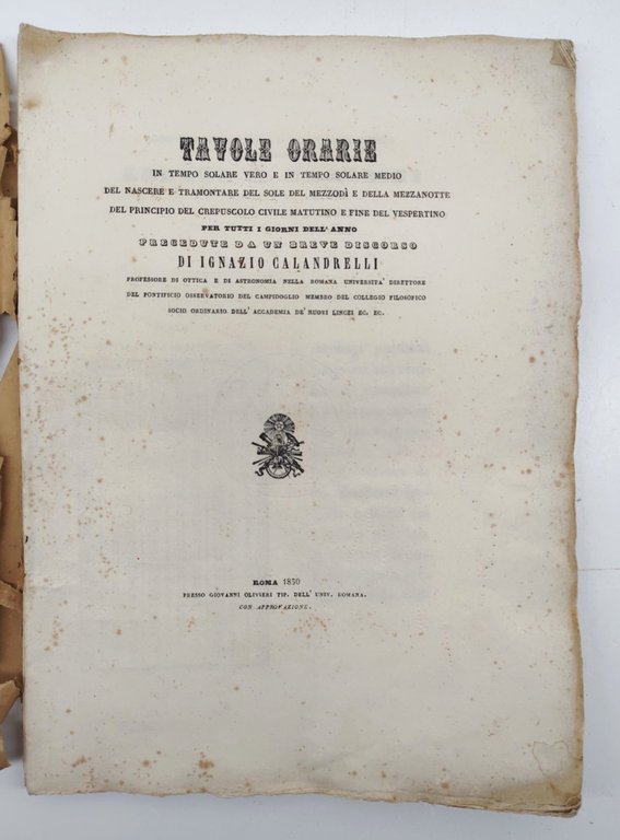 Tavole orarie in tempo solare vero e in tempo solare medio del nascere e tramontare del sole del mezzodì e della mezzanotte del principio del crepuscolo civile matutino e fine del vespertino per tutti i giorni dell'anno precedute da un breve discorso di Ignazio Calandrelli professore di ottica e di astronomia nella romana università direttore del pontificio osservatorio del Campidoglio membro del collegio filosofico socio ordinario dell'Accademia dei nuovi Lincei ec. ec.