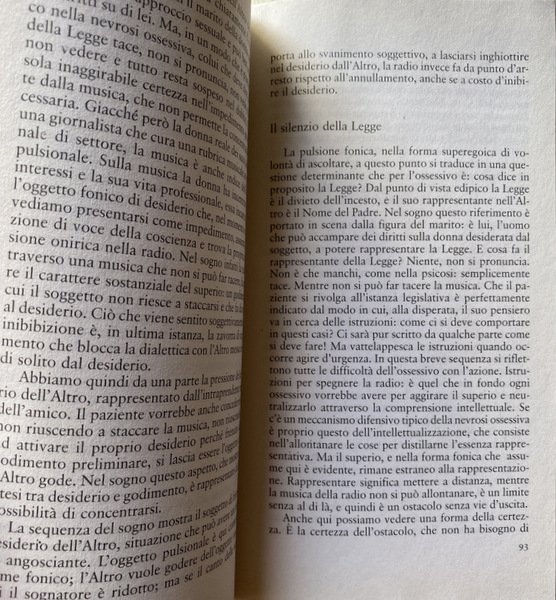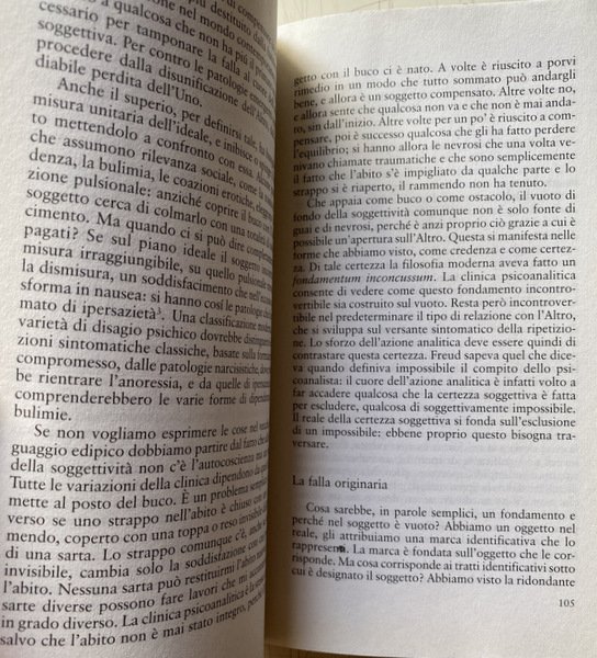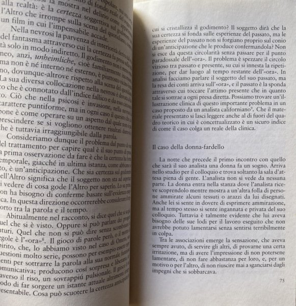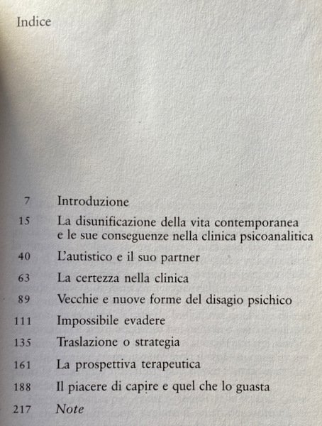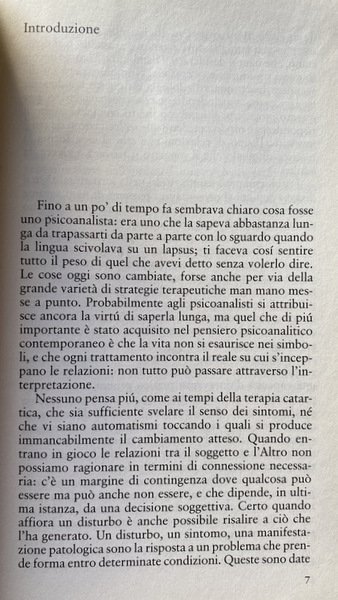 Si tratta di un interessante tentativo di recuperare, in chiave teorica, quella peculiarità e quella proficuità che caratterizzano l'approccio psicoanalitico alla clinica della psicopatologia contemporanea. Punto di partenza è un raffronto epistemologico con quei modelli più tecnici ed empiricamente oggettualizzanti che si rifanno all'area delle neuroscienze. Attraverso la matrice teorica lacaniana l'autore cerca di mostrare come la psicoanalisi vada, e debba andare, al di là di una scientificità empirica. Oggetto della psicoanalisi non è, infatti, la mente oggettualizzata delle neuroscienze o di altre pratiche terapeutiche, quanto, piuttosto, una relazione: la relazione tra il soggetto e l'Altro. L'autore, attraverso esemplificazioni cliniche e confronti con diverse figure e scuole che compongono il panorama della psicoanalisi contemporanea, analizza questa relazione con attenzione a come essa si declina nella costruzione della personalità del soggetto, sia nelle modalità di "godimento", sia in quelle di formazione dei sintomi. Soggetto e Altro sono impegnati in una complessa relazione, che - sostiene Focchi - non può essere riduttivamente e unicamente simbolica, dal momento che esiste un "reale pulsionale" (che non è biologico né‚ genetico) quale elemento fondante e fondativo della relazione stessa. Un "reale" che, accompagnato dalla decisione soggettiva inconscia, è garanzia della non necessità logica della relazione e dello stesso transfert (che non è soltanto una ripetizione). Fine specifico della psicoanalisi non è, pertanto, quello di "riparare l'Uno che si è guastato, ma di decostruire l'unità illusoria dell'Altro per far apparire i modi del godimento del soggetto".