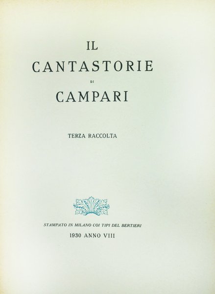 In-4, brossura orig., sovracoperta (piccole manc. ai bordi), pp.nn. 116, ornato da delicati grandi capilettera e finalini in azzurro. Raccolta di 108 poesie dedicate al Bitter e al Cordial Campari.Tiratura di 1000 esemparil. Testo ben conservato.