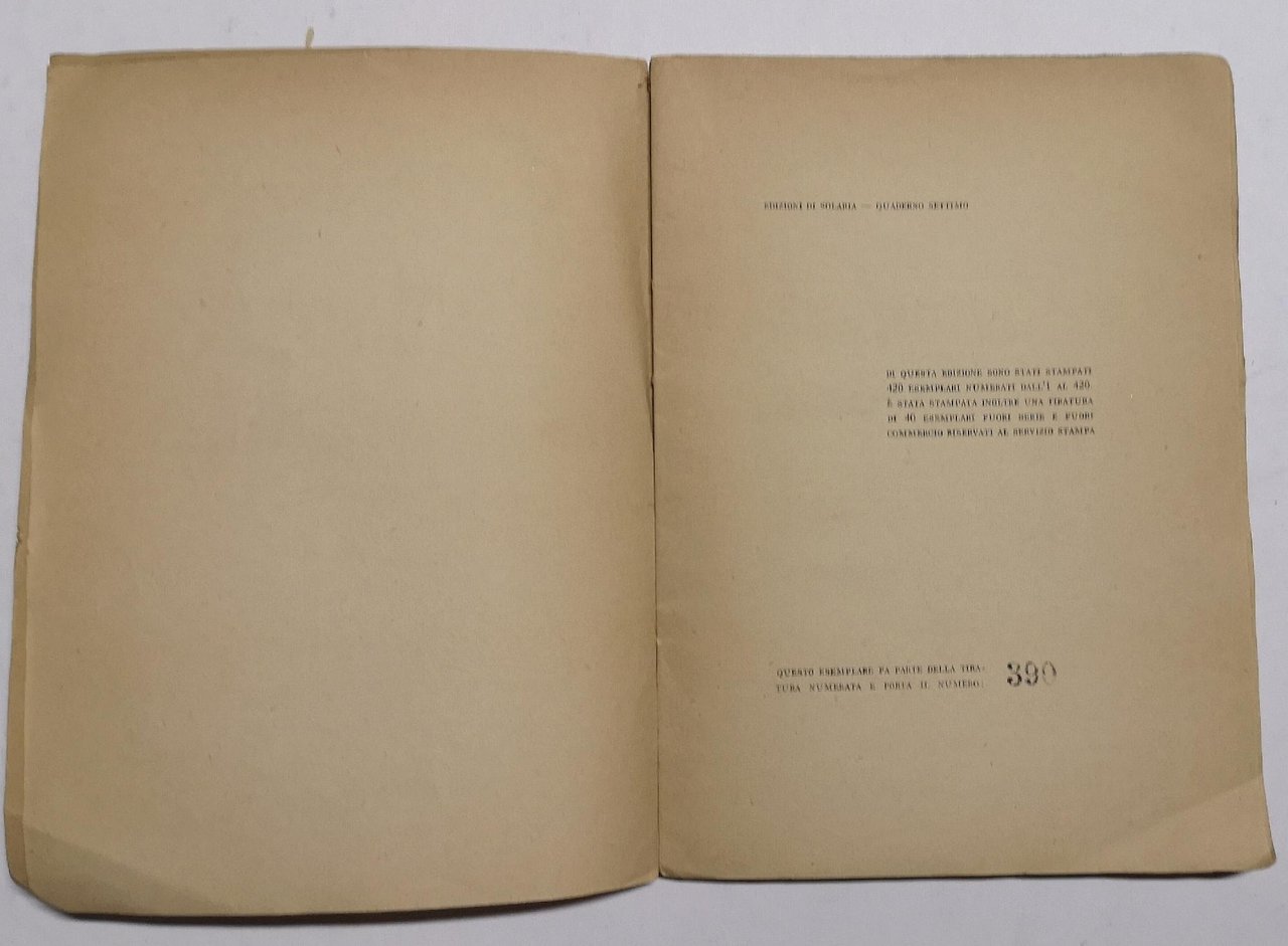 >in-16, pp. 63, (7), con 2 disegni di Longanesi. Broch. edit. Edizione originale, tirata a 420 esemplari numerati (ns. 390). Perfetto esemplare. Gambetti - Vezzosi, p. 751. Spaducci, p. 243.