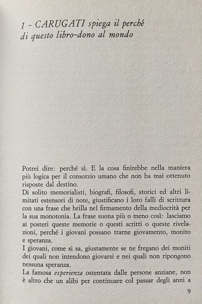 CARUGATI è generoso, aggressivo, umano, provocatorio, dolce, sexy, antitrombonesco, sarcastico e pacifista. In questo libro, classificabile indifferentemente come autobiografia romanzata, come documento comico, come musical grottesco, CARUGATI ci presenta un esilarante memoriale su settant'anni di vita italiana.