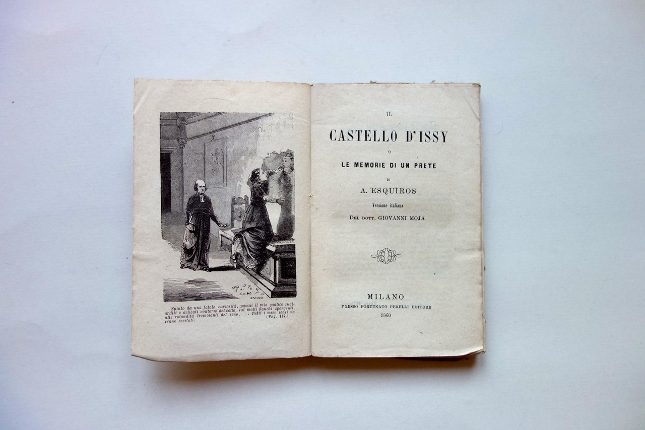 A. Esquiros, Il castello d'Issy o le memorie di un prete di A. Esquiros versione italiana del dott. Giovanni Moja Presso Fortunato Perelli, Milano 1860; cm 15,5x10; pp. 206 con una ill. in b/n all'antiporta; brossura ed. d'attesa. Condizioni di conservazione Esemplare in condizioni pi√π che discrete con tracce d'uso, dorso e brossura posteriore con alcuni strappetti e mancanze, con conseguente allentamento delle cuciture (vedi foto); interni peraltro buoni con qualche minima brunitura. OPEB.5228 N