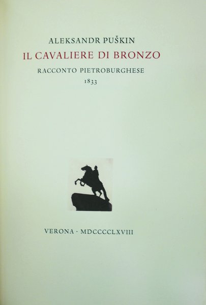 In-4 p., legatura edit. in mz. pergamena, piatti in carta Lima riprodotta, astuccio in cartone, pp. 62, al frontespizio una calcografia del monumento a Pietro il Grande a Leningrado. Versi nella lingua originale russa (secondo l'edizione delle Belles Lettres Mosca-Leningrado, 1964), con a fronte la traduzione in versi di Nerina Martini Bernardi. Opera composta con caratteri Puskin (di Wadim Lazursky) e Dante; titoli e iniziali in rosso. Cfr. Cat. Mardersteig,153.Tiratura di 165 esemplare numerati, su carta a tino Magnani, tutti firmati nel colophon dai due creatori dei caratteri usati. Il ns., 31, è in ottimo stato.