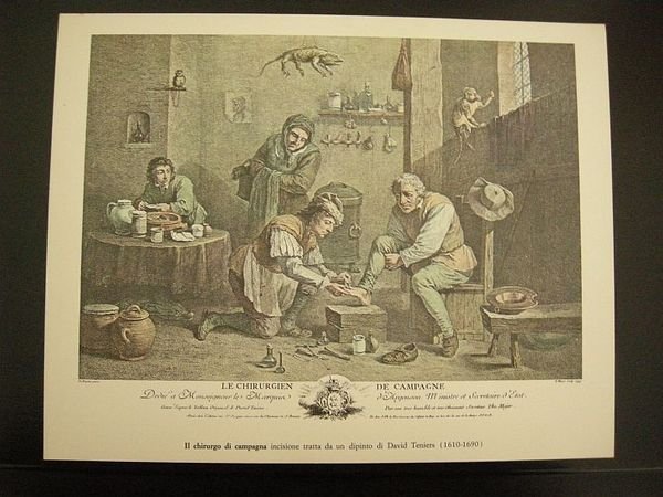 Il chirurgo di campagna. Incisione tratta da un dipinto di David Teniers (1610-1690).