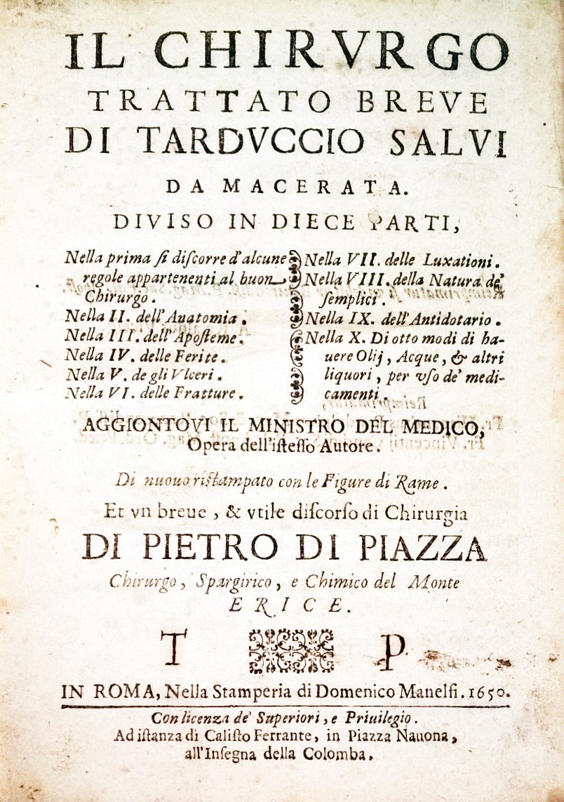 Il chirurgo trattato breve di Tarduccio Salvi da Macerata. Diviso in dieci parti, nella prima si discorre d'alcune regole appartenenti al buon chirurgo. Nella II. dell'anatomia. Nella III. dell'aposteme. Nella IV. delle ferite. Nella V. de gli ulceri. Nella VI. delle fratture. Nella VII. delle luxationi. Nella VIII. della natura de' semplici. Nella IX. dell'antidotario. Nella X. di otto modi di havere olij, [.] Aggiuntovi Il ministro del medico, [.] Et un breve, & utile discorso di chirurgia di Pietro Di Piazza [.].