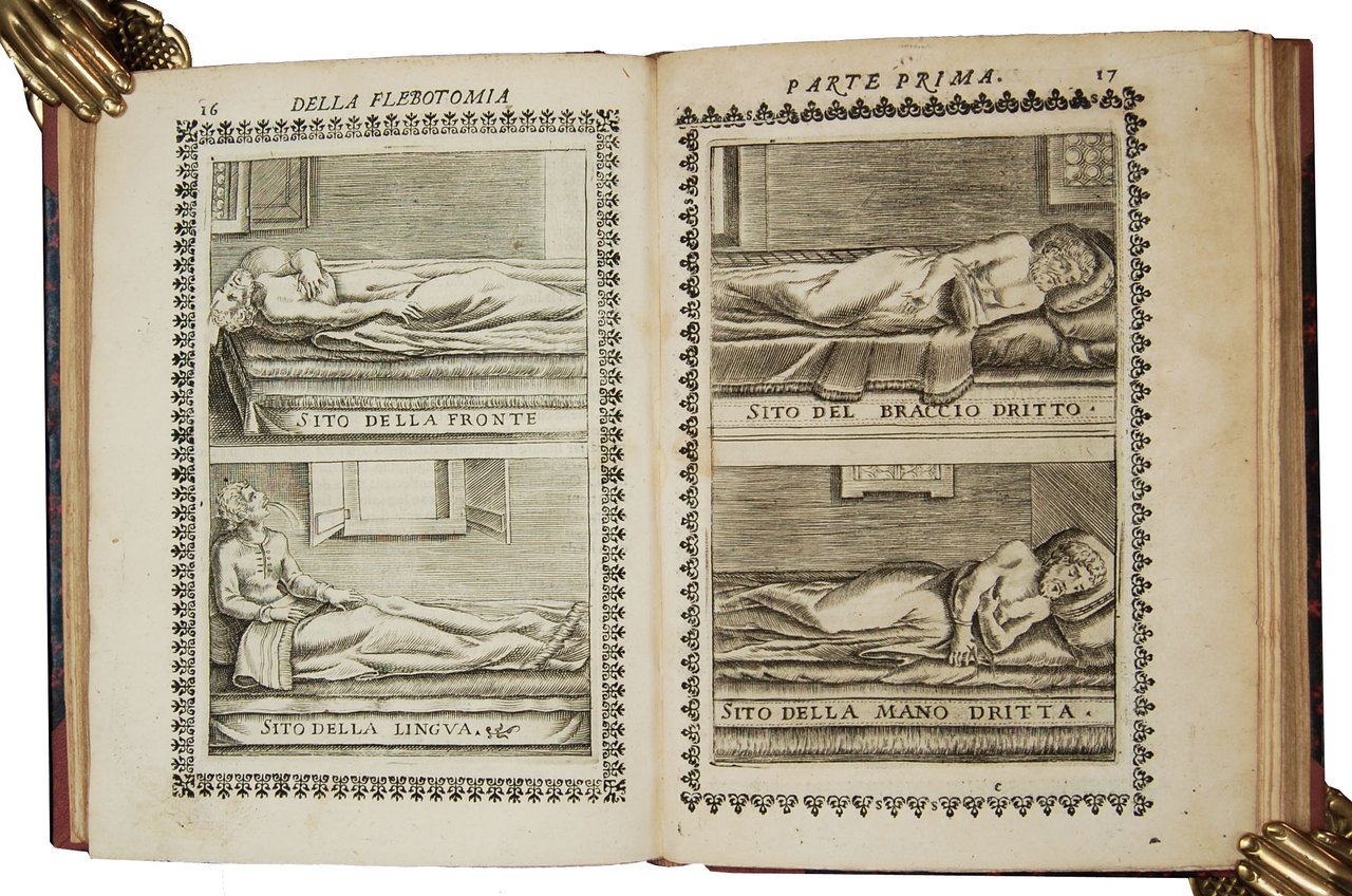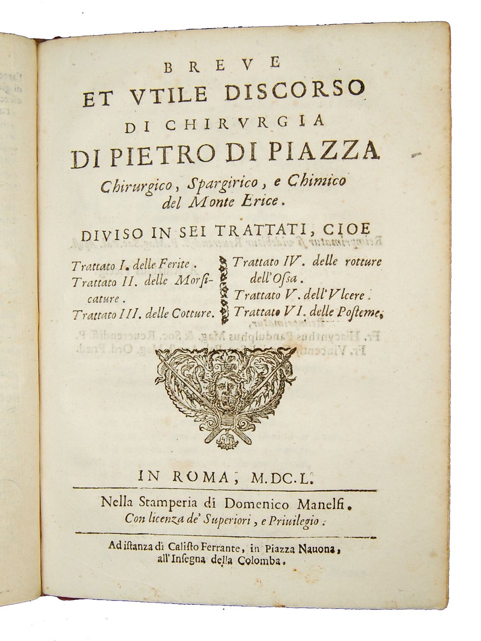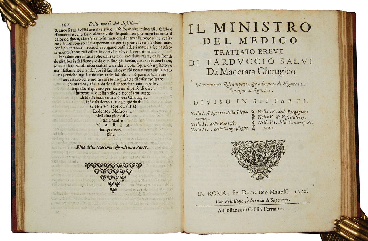 in-4° (204x150 mm), legatura moderna in mezza tela con carta marmorizzata ai piatti, titolo in oro al dorso; 3 opere rilegate insieme; pp. [8], 168; [4], 59, [1]; [4], 79, [1]. Rara raccolta di tre opere legate insieme, tra cui un trattato di chirurgia e uno sull'opera del medico, entrambi di Tarduccio Salvi, e un'altra opera di chirurgia, di Pietro Di Piazza. Titoli delle altre opere: [2.]: Salvi, Tarduccio. Il ministro del medico trattato breve di Tarduccio Salvi da Macerata chirurgo nuovamente ristampato, [.] diviso in sei parti. Nella I. si discore della flebotomia [.] Nella VI. delli cauterij attuali. In Roma: per Domenico Manelfi, 1650. [3.]: Di Piazza Pietro, Breve et utile discorso di chirurgia. In Roma: nella Stamperia di Domenico Manelfi, 1650. Ogni opera ha il proprio frontespizio, con una piccola incisione xilografica. Presenza di alcune iniziali e fregi xilografici. La seconda opera contiene 13 xilografie nel testo (alcune delle quali a piena pagina). Terza edizione delle due opere di Tarduccio Salvi, pubblicate per la prima volta nel 1613, rilegata insieme alla prima edizione del testo di Di Piazza. Riferimenti: IT\ICCU\RMSE\007273. OCLC, 14318886. Condizioni: Presenza di alcune rare macchie e lievi aloni d'umidità, ma nel complesso esemplare molto buono e completo. -- RARE COLLECTION OF THREE WORKS BOUND TOGETHER INCLUDING A TREATISE OF SURGERY AND ONE ON THE PHYSICIAN WORK, BOTH BY TARDUCCIO SALVI, AND ANOTHER WORK ON SURGERY, BY PIETRO DI PIAZZA. Cond.: Presence of some rare spots and mild water-stains, but overall very good and complete copy.