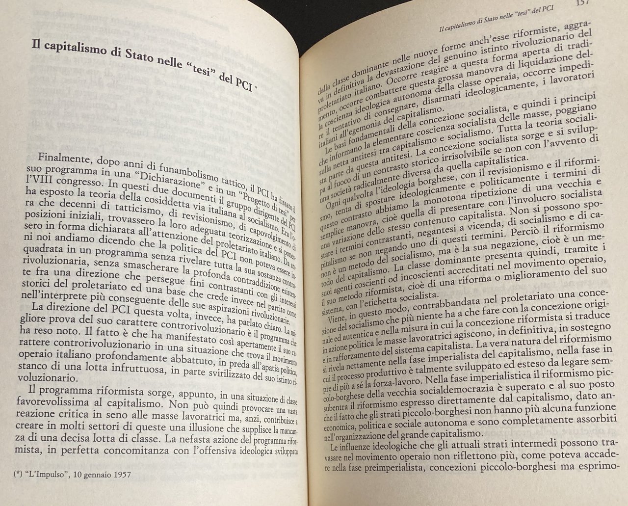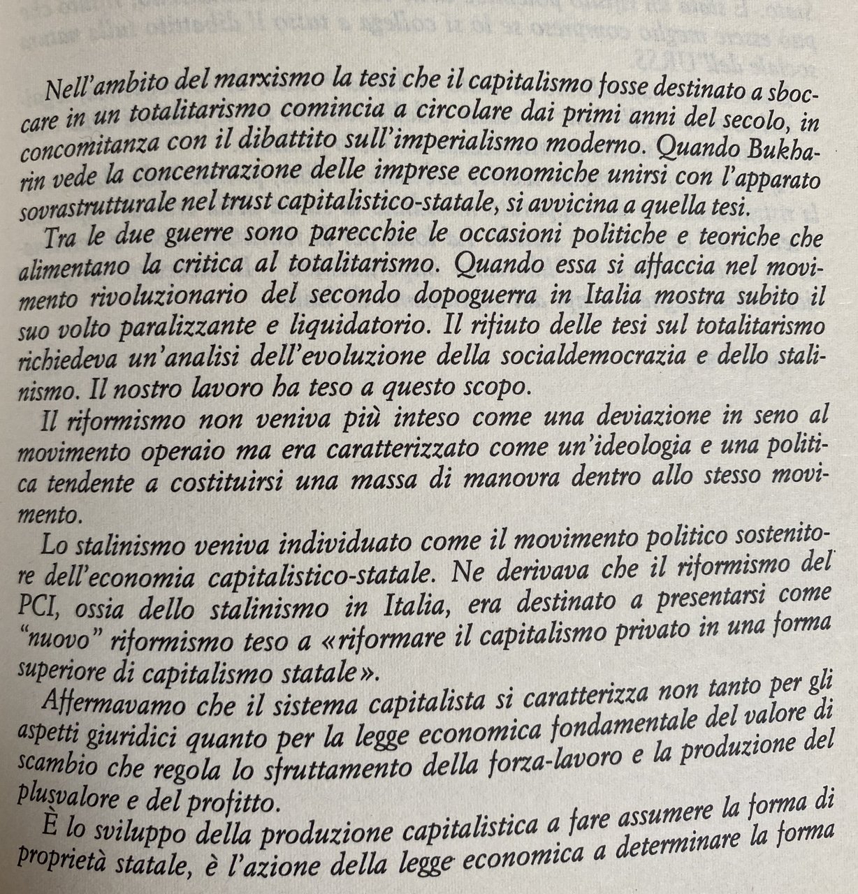 Nell'ambito del marxismo la tesi che il capitalismo fosse destinato a sboccare in un totalitarismo comincia a circolare dai primi anni del secolo, in concomitanza con il dibattito sull'imperialismo moderno. Quando Bukharin vede la concentrazione delle imprese economiche unirsi con l'apparato sovrastrutturale nel trust capitalistico-statale, si avvicina a quella tesi. Tra le due guerre sono parecchie le occasioni politiche e teoriche che alimentano la critica al totalitarismo. Quando essa si affaccia nel movimento rivoluzionario del secondo dopoguerra in Italia mostra subito il suo volto paralizzante e liquidatorio. Il rifiuto delle tesi sul totalitarismo richiedeva un'analisi dell'evoluzione della socialdemocrazia e dello stalinismo. Il nostro lavoro ha teso a questo scopo. Il riformismo non veniva più inteso come una deviazione in seno al movimento operaio ma era caratterizzato come un'ideologia e una politica tendente a costituirsi una massa di manovra dentro allo stesso movimento. Lo stalinismo veniva individuato come il movimento politico sostenitore dell'economia capitalistico-statale. Ne derivava che il riformismo del PCI, ossia dello stalinismo in Italia, era destinato a presentarsi come nuovo riformismo teso a riformare il capitalismo privato in una forma superiore di capitalismo statale. Affermavamo che il sistema capitalista si caratterizza non tanto per gli aspetti giuridici quanto per la legge economica fondamentale del valore di scambio che regola lo sfruttamento della forza-lavoro e la produzione del plusvalore e del profitto. E lo sviluppo della produzione capitalistica a fare assumere la forma di proprietà statale, è l'azione della legge economica a determinare la forma giuridica.