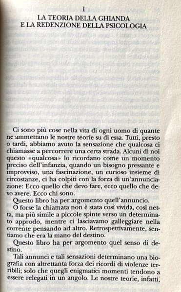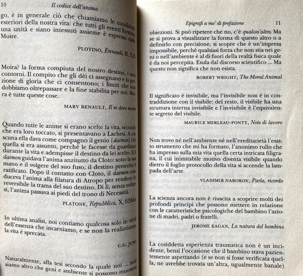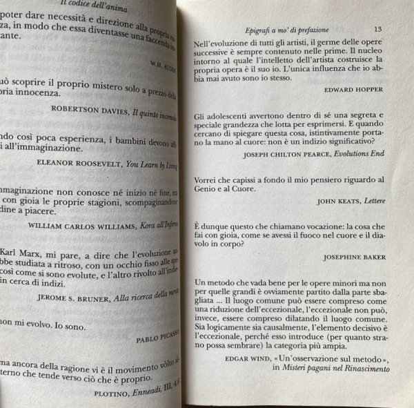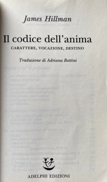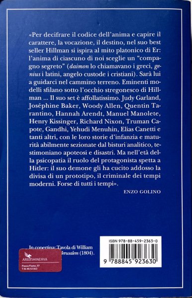 Soggetti: Psicologia, Io, Ego, Identità, Personalità, Caratteriologia, Destino, Demone, Psicanalisi, Filosofia, Anima, Archetipi, Carl Gustav Jung, Complesso di Edipo, Freud, Puer aeternus, Psicologi junghiani, Male, Inconscio collettivo, Miti, Immaginazione, La vana fuga dagli dèi, Ermes-Mercurio, Sé, Guarigione, Intossicazione Ermetica, Rete, Internet, Relazioni, Teoria della ghianda, Analisi, Redenzione, Compensazione, Bellezza, Bambini, Solitudine, Esilio, Personaggi illustri, Luci della ribalta, Spettacolo, Artisti, Attori, Scrittori, Intellettuali, Letteratura, Cultura, Superstizione parentale, Madri, Padri, Genitori, Maternità, Antenati, Discendenza, Decostruire, Assenza, Amore, Pensiero mitico, Intuizione, Crescita, Scuola, Fantasia, Fumetto, Ingegno, Fato, Fatalismo, Gemelli, Individualità, Doppio, Biografie, Nomi, Soprannomi, Spirito Demoniaco, Telos, Teleologia, Necessità, Bisogni, Libri Vintage Fuori catalogo, Saggi, Americani, Carattere americano, Bibliografia, Riferimento, Metodo, Hitler, Prevenzione, Ethos, Natura, Mediocrità, Epigrafi, Aforismi, Platone, Nabokov, Kagan, Plotino, Hopper, Davies, Eats, Poesia, Bruner, Bibbia, Religioni, Infanzia, Oblio, Apocalisse, Psichiatria, Psychology, I, Ego, Identity, Personality, Characterology, Destiny, Demon, Psychoanalysis, Philosophy, Archetypes, Oedipus complex, Jungian psychologists, Evil, Collective unconscious, Myths, Imagination, The vain flight from the gods, Hermes-Mercury, Self, Healing, Hermetic intoxication, Network, Relations, Acorn theory, Analysis, Redemption, Compensation, Beauty, Children, Loneliness, Exile, Famous people, Limelight, Entertainment, Artists, Actors, Writers, Intellectuals, Literature, Culture, Parental superstition, Mothers, Fathers, Parents, Maternity, Ancestors, Offspring, Deconstruct, Absence, Love, Mythical thought, Intuition, Growth, School, Fantasy, Comics, Wit, Fate, Fatalism, Twins, Individuality, Double, Biographies, Names, Nicknames, Demonic Spirit, Teleology, Necessities, Needs, Out of print Books, Essays, Americans, American Character, Bibliography, Reference, Method, Prevention, Nature, Mediocrity, Epigraphs, Aphorisms, Poetics, Bible, Religions, Childhood, Oblivion, Apocalypse, Psychiatry