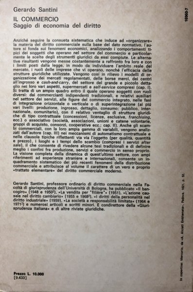 Soggetti: Diritto commerciale Italiano, Economia, Attività Produttive, Scienze Giuridiche, Navigazione, Diritto Privato, Diritto Pubblico, Scienze Politiche, Teoria dello Stato, Manuali, Commercio, Scritti giuridici, Servizi, Norme, El comercio: ensayo de economía del derecho, Fiere, Mercato, Industria, Contratti, Soccida, Agricoltori, Imprese, Distribuzione, Dettaglio, Costituzione, Finanziamento, Logistica, Mercati ortofrutticoli, Venditori, Associazioni professionali, Ingrosso, Regolamenti, Filiere, Borsa Merci, Borse estere, Grandi Magazzini, Supermercati, Centri commerciali, Ipermercati, Cash-and Carry, Licenze, Ruoli, Società, Registri, Esercenti, Procacciatori d'affari, Agenti, Broker, Export, Import, Produttori, Franchising, Concessionari, Cooperative, Integrazione, Aima, Federconsorzi, Codici, Scambi, Incoterms, Vendite, Domicilio, Fattispecie, Disciplina, Asta, Self-service, Direct marketing, Corrispondenza, Catalogo, Telefono, Televisione, Visto e piaciuto, Standard, Qualità, Telle-quelle, Tale-Quale, Premio, Boule de neige, Blocco, Sottocosto, Leggi, Legislazione, Sconti, Liquidazione, Spedizione, Contrassegno, Prezzi, Consumo, Leasing, After-sale, Garanzia, Rate, Libri Vintage, Fuori catalogo, Saggistica, Italian Commercial Law, Economics, Productive Activities, Law, Private Law, Public Law, Laws, Political Science, State Theory, Manuals, Commerce, Legal Writings, Services, Rules, Fairs, Market, Industry, Contracts, Soccida, Farmers, Companies, Distribution, Detail, Constitution, Financing, Logistics, Fruit and Vegetable Markets, Sellers, Professional Associations, Wholesale, Regulations, Supply Chain, Commodities Exchange, Foreign Exchange, Department Stores, Supermarkets, Shopping Centers, Hypermarkets, Licenses, Roles, Companies, Registers, Merchants, Business Procurers, Agents, Manufacturers, Dealers, Cooperatives, Integration, Codes, Exchanges, Sales, Home, Case, Discipline, Auction, Correspondence, Catalog, Telephone, Seen and liked, Quality, Such-Which, Prize, Block, Sub-cost, Discounts, Liquidation, Shipment, Cash on delivery, Prices, Consumption, Guarantee, Rate, Books out of print, Essay