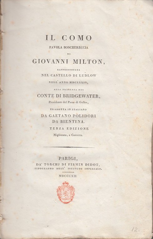 In-8 (Cm 24 x 15,5), pp. 80, cartonato editoriale coevo. Testo tradotto da Gaetano Polidori da Bientina (1764-1853), letterato e scrittore di teatro, fu tra l'altro per 4 anni segretario personale di Vittorio Alfieri, e poi si trasferì a Londra, svolgendovi l'attività di traduttore e di insegnante; sua figlia sposò Gabriele Rossetti. Teso dedicato dal Polidori a Frances Henry Egerton il cui avo aveva partecipato alla prima rappresentazione dell'opera di MIlton presso il castello di Ludlow nel 1634 e per il quale l'opera fu scritta allor quando fu nominato presidente del Galles. Alla prima rappresentazione i ruoli principali furono recitati dai figli del conte. Contestualmente a questa edizione venne pubblicata sempre per i tipi Didot di Parigi anche l'edizione francese. Frontespizio con impresso in sanguigna il sigillo nobiliare della casata Bridgewater. Qualche macchiolina sparsa, un po' allentato, qualche minimo segno d'uso peraltro copia molto buona.