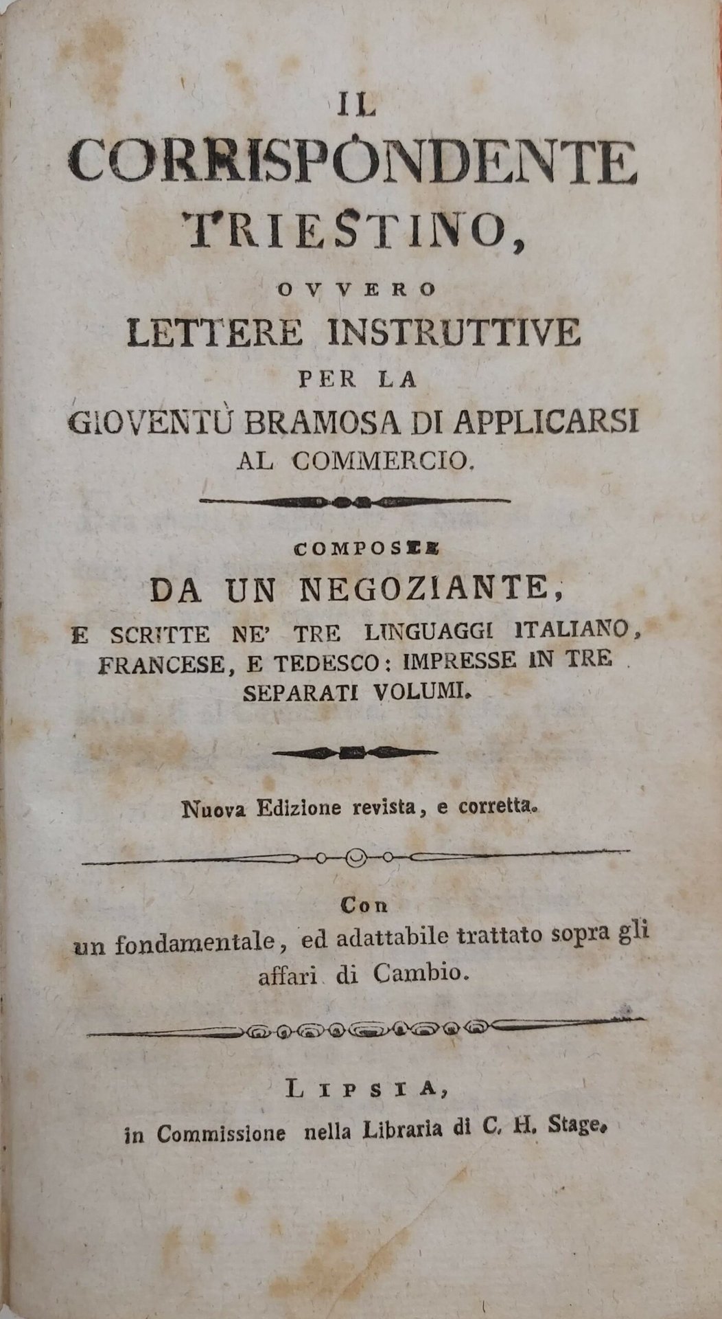 IL CORRISPONDENTE TRIESTINO ovvero Lettere instruttive per la gioventù bramosa di applicarsi al commercio. Composte da un negoziante e scritte ne’ tre linguaggi italiano, francese e tedesco, impresse in tre separati volumi. Con un fondamentale ed adattabile trattato sopra gli affari di cambio. Lipsia, Stage, s.d. Unito: AN. LE CORRESPONDANT TRIESTIN ou Lettres instructives.
