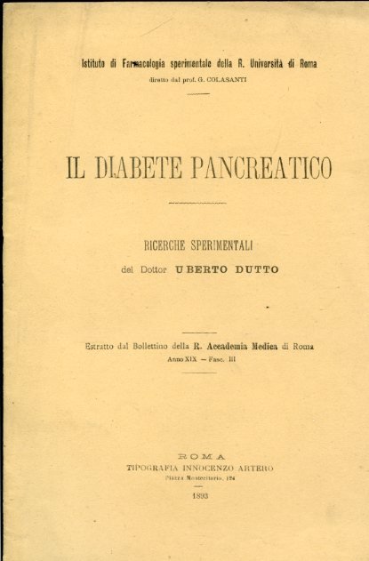 Il diabete pancreatico. Ricerche sperimentali. Estratto dal Bollettino della R. Accademia Medica di Roma. Anno XIX - Fasc. III