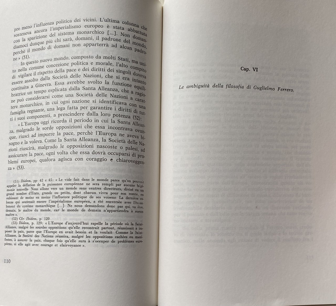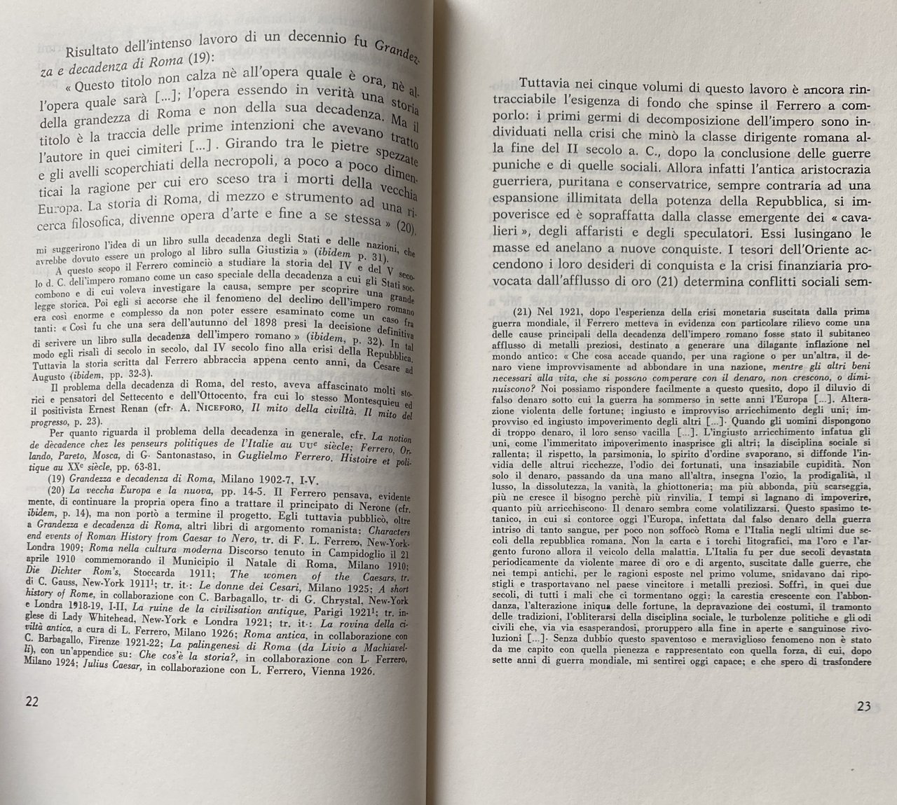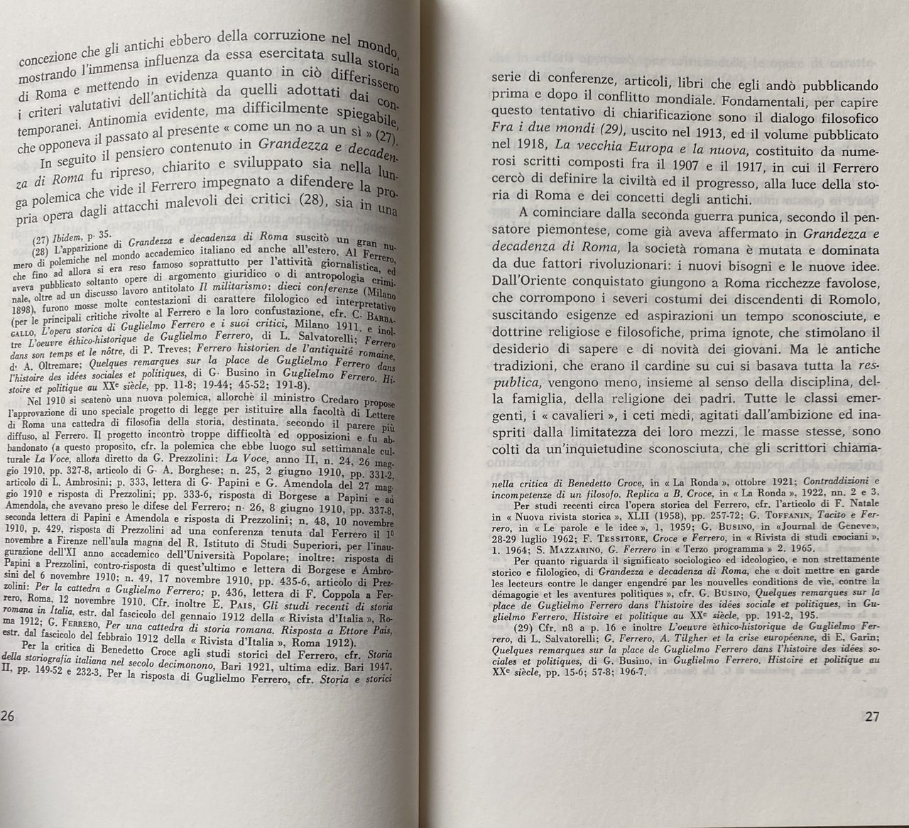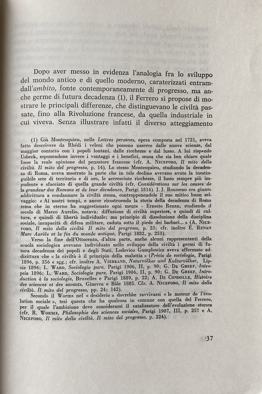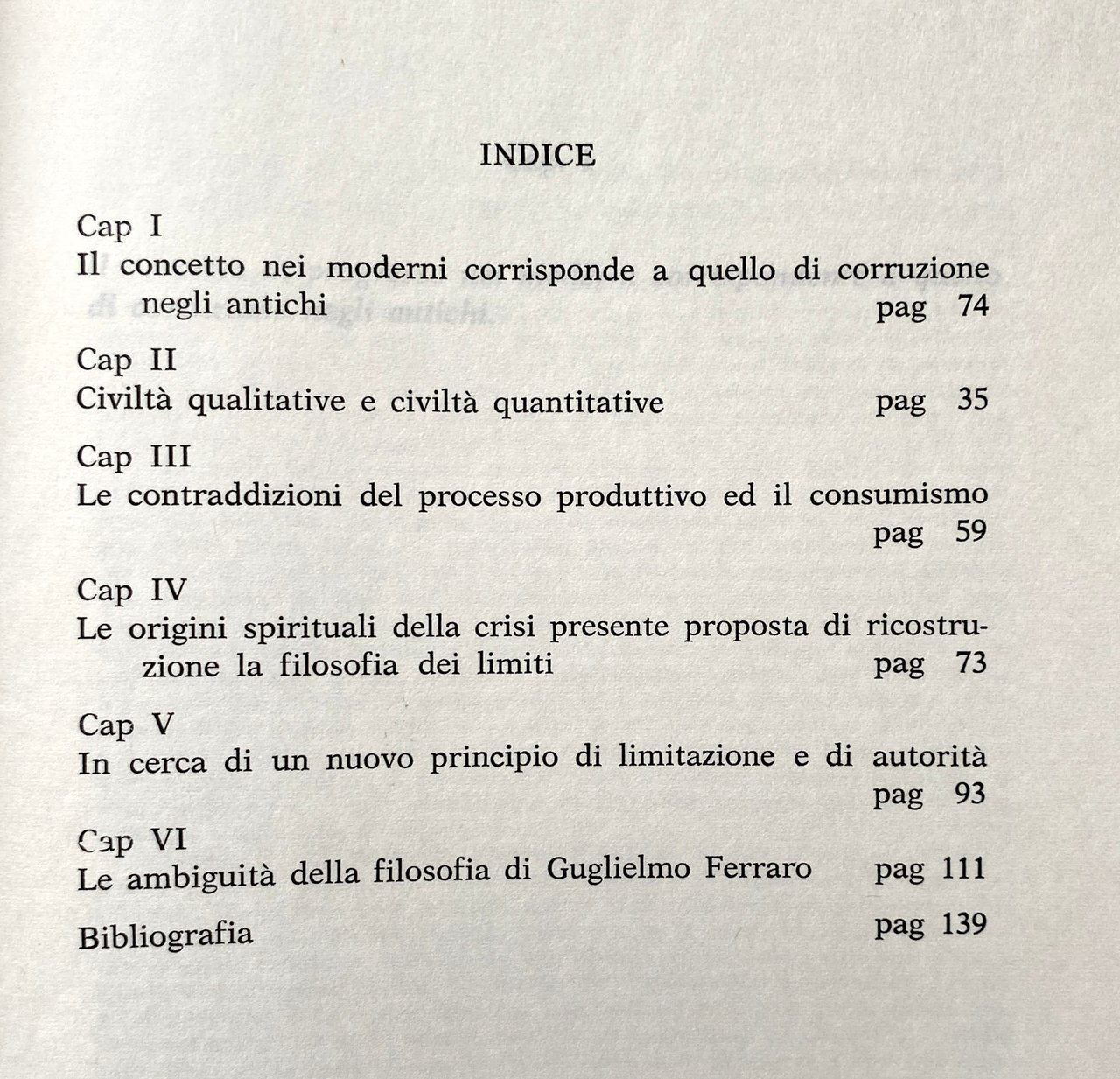 Soggetti: Studi su Guglielmo Ferrero, Storiografia, Filosofia della storia, Pensiero filosofico, Concezione storica, Corruzione, Civiltà, Antichi, Modernità, Cultura, Marxismo, Consumismo, Crisi, Autorità, Simone Weil, Voegelin, Chabod, Tilgher, Rostovtzeff, Santo Mazzarino, Jaspers, Dawson, Bibliografia, Sociologia, Positivismo, Antropologia Criminale, Diritto, Grandezza Decadenza, Impero romano, Cesare, Augusto, Imperatori, Mommsen, Militarismo, Potere, Lotta di classe, Crispi, Guglielmo II, Europa, America, Storia romana antica, Processo, Decadenza, Saggi storici, Critica storiografica, Libri rari Vintage fuori catalogo, Collezionismo, Rarità, Studi storici, Dialettica materialistica, Materialismo storico, Bibliografia, Riferimento, Interpretazione, Eventi, Fenomenologia, Progresso, Jean Bodin, Bacone, Cartesio, Illuminismo, Condorcet Etica Kant Influenze culturali Pensiero filosofico Hegel Karl Marx Comte Tennyson Tecnica J.F. Bury Destino Divenire Corrado Barbagallo H. Belloc G. Bernanos G. Busino Spirito Macchine Novecento Giudizio Crisi Ernst Bloch E. Carr J. Danielou Benedetto Croce Politica Liberalismo Democrazia Comunismo Totalitarismo E. Drumont Socialismo Mircea Eliade Criminalità Criminologia Violenza Forza Scipio Sighele Delitto Morale primitiva Germania Nazismo Fascismo Militarismo Nerone Guerre Pace Versailles Potere Tecnocrazia Cattolicesimo Chiesa Controrivoluzione Tessitore Treves Charles Péguy Maritain Niceforo Hans Sedlmayr Sermonti Ortega Y Gasset Oswald Spengler Guerre mondiali Monografie Römische Geschichte Pouvoir Legittimità Cicli Stato Hippolite Taine Tucidide Tacito Polibio Teoria ciclica Mutamento Sistemi politici Palingenesi Fini Gaetano Mosca Bogdan Raditsa Luca Tedesco Lorella Cedroni Luca Fezzi Matthias Gelzer Realismo politico Vilfredo Pareto Volontà Weber Tammany Hall Rapporti Borghesia Forze Cultura ferreriana Intellettuali napoletani Studies on, Historiography Philosophy of history Philosophical thought Historical conception Corruption Civilization Modernity Culture Marxism Consumerism Crisis Authority Bibliography Sociology Positivism Anthropology Criminal Law Greatness Decadence Roman Empire Rome Caesar Augustus Emperors Militarism Power Class struggle Europe Ancient history Trial Decadence Historical essays Historiographical criticism Books rare out of print Collectibles Rarity Historical studies Materialistic dialectics Historical materialism Bibliography Reference Interpretation Events Phenomenology Progress Descartes Enlightenment Ethics Cultural influences Philosophical thought Technique Destiny Becoming Spirit Machines Twentieth century Judgment Crisis Politics Liberalism Democracy Communism Totalitarianism Crime Criminology Violence Force Primitive morality Germany Nazism Fascism Militarism Nero Wars Peace Power Technocracy Catholicism Church Counter-revolution World Wars Monographs Legitimacy Cycles State Thucydides Tacitus Polybius Cyclic Theory Change Political Systems Palingenesis Goals Political Realism Relationships Bourgeoisie Forces Ferrerian Culture Neapolitan Intellectuals
