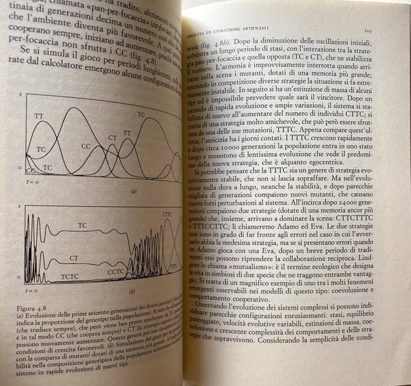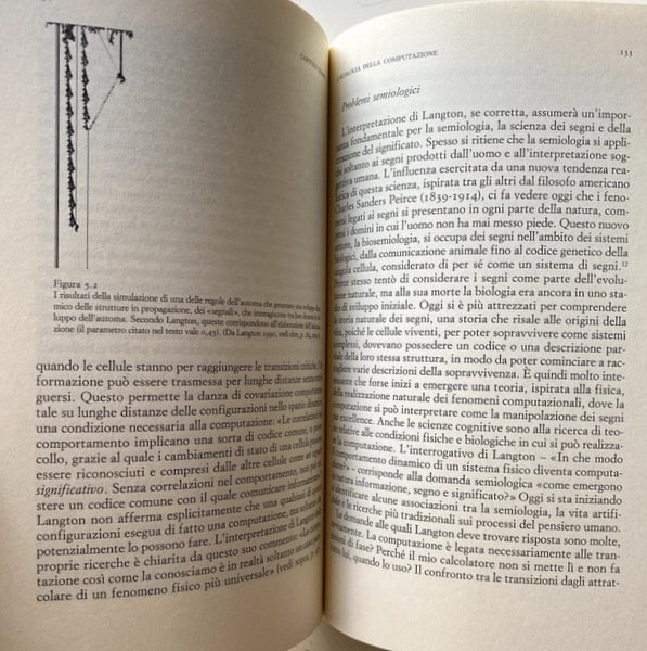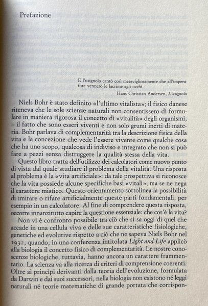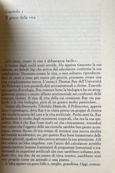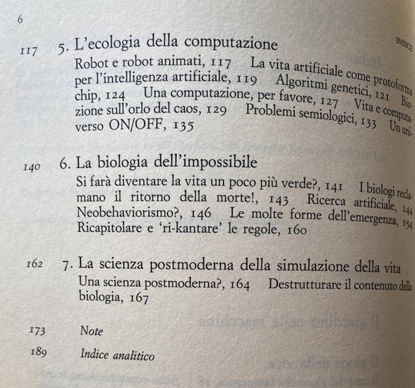 Soggetti: Scienza, Scienze della vita, Biologia, Darwin, Evoluzione, Los Alamos, Vita artificiale, Esobiologia, Conoscenza frattale, Misticismo, Cellule, Riproduzione, Logica, Chimica, von Neumann, Morte, Divisione cellulare, Algoritmi, Piante, Vegetali, Genetica, Geni, DNA, Filosofia, Uccelli, Animali, Stormi artificiali, Macchine, Modelli, Esperimenti, Reti genetiche, Compitazione, Ecologia, Robot, Animazione, Caos, Segni, Semiologia, Algoritmo, Microchip, Neo-behaviorismo, Emergenza, Ricerca, Scienziati, Postmodernismo, Destrutturazione, Saggi, Libri Fuori catalogo, Divulgazione scientifica, Kant, Etica, Niels Bohr, Vitalismo, Teorie scientifiche, Principi, Computer, Thomas Ray, Khun, Genotipi, Generazioni, Simulazioni, Armonia, Proteine, Intelligenza artificiale, Realtà virtuale, Alienazione, Droz, Gould, Langton, Automi, Genoma umano, Scienze cognitive, Cervello, Emozioni, John Searle, Extraterrestri, Reti neurali, Connessioni, Neuroni, Newton, Virus, Matematica, Programmazione, Linguaggio, Maturana, Turing, Peirce, Fisica, Feynman, Sagan, Istruzioni, Robotica, Entropia, Intenzionalità, Aristotele, Meccanicismo, Craig Reynolds, Batman, Tim Burton, Marcia dei pinguini, Gotham City, Il re leone, Walt Disney, Carica della mandria di gnu, Eptalogo, Science, Life sciences, Biology, Darwin, Evolution, Los Alamos, Artificial life, Esobiology, Fractal knowledge, Mysticism, Cells, Reproduction, Logic, Chemistry, Death, Cell division, Algorithms, Plants, Vegetables, Genetics, Genes, Philosophy, Birds, Animals, Artificial flocks, Machines, Models, Experiments, Genetic networks, Spelling, Ecology, Animation, Chaos, Signs, Semiology, Algorithm, Neo-behaviorism, Emergency, Research, Scientists, Postmodernism, Destructuring, Essays, Out of print books, Scientific dissemination, Ethics, Vitalism, Scientific theories, Principles, Genotypes, Generations, Simulations, Harmony, Proteins, Artificial intelligence, Virtual reality, Alienation, Automata, Human genome, Cognitive science, Brain, Emotions, Extraterrestrials, Neural networks, Connections, Neurons, Mathematics, Programming, Language, Physics, Instructions, Robotics, Entropy, Intentionality, Aristotle, Mechanism, March of the penguins, The lion king, Wildebeest, Heptalogue