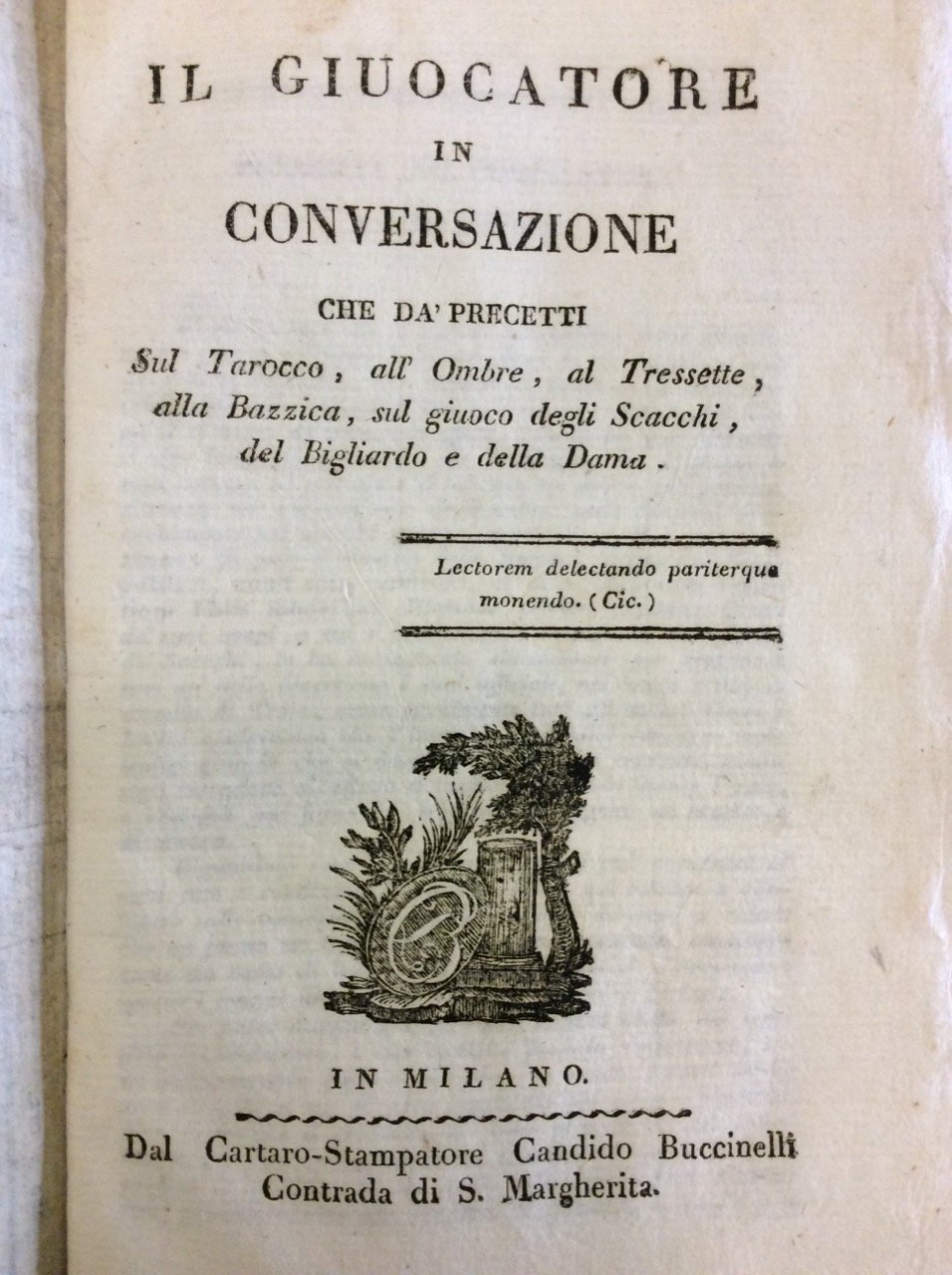 IL GIUOCATORE IN CONVERSAZIONE. - Che da' precetti sul Tarocco, all'Ombre, al Tressette, alla Bazzica, sul giuoco degli Scacchi, del Bigliardo e della Dama.