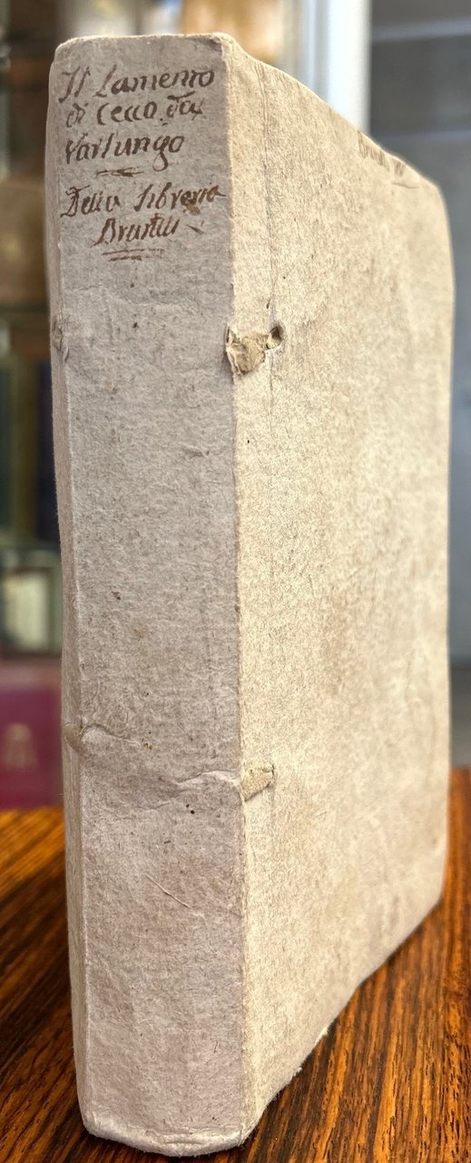 >in-8 (185x120 mm), pp. LX, 279, fregi, finalini e iniziali ornate incisi in silografia, carattere tondo e corsivo. Legatura coeva in cartonato rustico, titolo ms al dorso. Seguono il titolo: la dedica "Al nobile ornatissimo Signor marchese Don Antonio Terzi", la lunga prefazione, La vita del Baldovini, Il lamento di Cecco di Varlungo, le Aggiunte, La lettera di Pietro Massai, le 25 stanze e l' indice. Edizione aumentata rispetto alla prima del 1694. Idillio rusticale in quaranta ottave, Il protagonista è il contadino Cecco che canta il suo vano amore per la contadina Sandra. L'idillio per il titolo ricorda la novella boccaccesca della Belcolore e del prete di Varlungo, per l'argomento e per la forma chiaramente si ricollega al genere tradizionale della satira del villano, genere caro a Lorenzo de' Medici nella Nencia da Barberino, al Pulci nella Beca da Dicomano, al Doni e soprattutto nel Berni. Esemplare fresco (qualche sporadico puntino rosso), ex libris Bruno Brunelli Bonetti al contropiatto. Graesse, I, 281. Gamba, 1769, "Del "Lamento di Cecco" erasi fatta una buona ristampa in Bergamo, 1762". Brunet, I, 623, "avec l'augmentation de 25 stances addressées à Fr.Redi". Melzi, II, 63, cita altre edizioni.