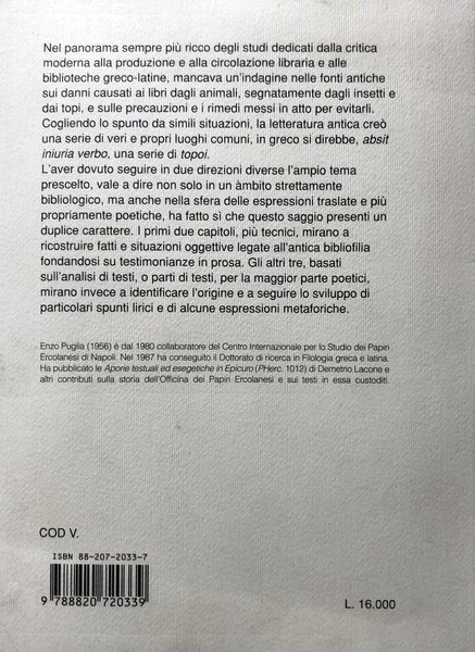 Soggetti: Storia antica, Archeologia, Scienze storiche ausiliarie, Circolazione libraria, Consultazione, Bibliologia, Bibliofilia, Informazione, Biblioteche greco-latine, Fonti antiche, Danni, Catalogazione, Storia del libro, Libri antichi, Conservazione, Condizioni, Usura, Umidità, Animali, Roditori, Cimici, Citocromi, Coleotteri, Uova, Animaletti, Ditteri, Artropodi, Insetti carticoli, Tarme, Topi, Tigne, Tignole, Vermi, Insetti, Spine, Corrosione, Precauzioni, Rimedi, Consigli, Guide, Pagine, Fogli, Tarli, Gore, Biblioteconomia, Libri vintage, Fuori catalogo, Curiosità, Aneddoti storici, Gestione della biblioteca, Archivistica, Beni culturali, Produzione, Critica letteraria, Testi, Volumi, Tomi, Papiri, Carta, Alessandria d'Egitto, Bibliotecari, Manutenzione, Insettifughi, Olio di cedro, Codice di Strabone, Attentatori, Letteratura greca, Arabeschi, Carte marcite, Atene, Poesia latina, Leonida, Aristone, Cristoforo di Mitilene, Gesuiti, Invettive, Polemiche, Manuali, Filologia, Classici, Rotoli, Cura, Restauri, Scaffali, Entomata, Ancient History, Archeology, Auxiliary Historical Sciences, Circulation, Consultation, Bibliology, Bibliophilia, Information, Greek-Latin Libraries, Ancient Sources, Damages, Cataloging, History of Books, Ancient Books, Conservation, Conditions, Wear, Humidity, Animals, Rodents, Bugs, Cytochromes, Beetles, Eggs, Dittos, Arthropods, Mice, Tines, Moths, Worms, Insects, Thorns, Corrosion, Precautions, Remedies, Tips, Guides, Pages, Leaves, Woodworms, Librarianship, Out of print, Curiosity, Historical anecdotes, Library management, Archiving, Cultural heritage, Production, Literary criticism, Texts, Volumes, Tomes, Papyruses, Paper, Alexandria, Librarians, Maintenance, Insect repellents, Oil of cedar, Strabo Code, Attackers, Greek literature, Arabesques, Rotten maps, Athens, Latin poetry, Leonidas, Ariston, Christopher of Mytilene, Jesuits, Invectives, Controversies, Manuals, Philology, Classics, Care, Restoration, Shelves
