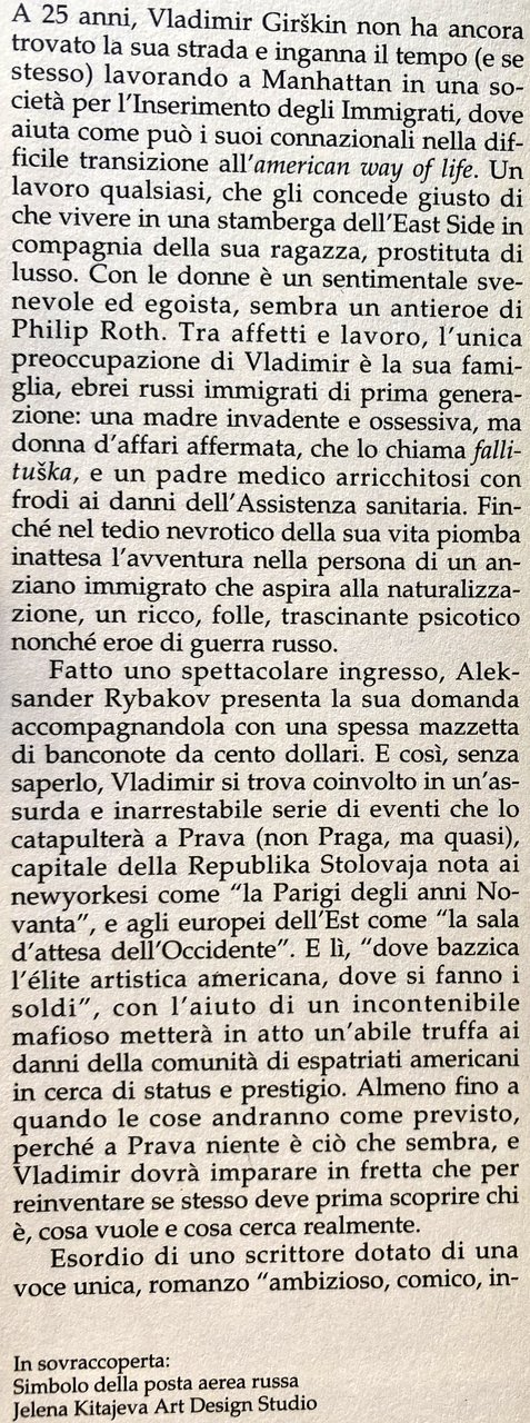 A 25 anni, Vladimir Girškin non ha ancora trovato la sua strada e inganna il tempo (e se stesso) lavorando a Manhattan in una società per l'Inserimento degli Immigrati, dove aiuta come può i suoi connazionali nella difficile transizione all'american way of life. Un lavoro qualsiasi, che gli concede giusto di che vivere in una stamberga dell'East Side in compagnia della sua ragazza, prostituta di lusso. Con le donne è un sentimentale svenevole ed egoista, sembra un antieroe di Philip Roth. Tra affetti e lavoro, l'unica preoccupazione di Vladimir è la sua famiglia, ebrei russi immigrati di prima generazione: una madre invadente e ossessiva, ma donna d'affari affermata, che lo chiama fallituška, e un padre medico arricchitosi con frodi ai danni dell'Assistenza sanitaria. Finché nel tedio nevrotico della sua vita piomba inattesa l'avventura nella persona di un anziano immigrato che aspira alla naturalizzazione, un ricco, folle, trascinante psicotico nonché eroe di guerra russo. Fatto uno spettacolare ingresso, Aleksander Rybakov presenta la sua domanda accompagnandola con una spessa mazzetta di banconote da cento dollari. E così, senza saperlo, Vladimir si trova coinvolto in un'assurda e inarrestabile serie di eventi che lo catapulterà a Prava (non Praga, ma quasi), capitale della Republika Stolovaja nota ai newyorkesi come la Parigi degli anni Novanta, e agli europei dell'Est come la sala d'attesa dell'Occidente. E lì, dove bazzica l'élite artistica americana, dove si fanno i soldi, con l'aiuto di un incontenibile mafioso metterà in atto un'abile truffa ai danni della comunità di espatriati americani in cerca di status e prestigio. Almeno fino a quando le cose andranno come previsto, perché a Prava niente è ciò che sembra, e Vladimir dovrà imparare in fretta che per reinventare se stesso deve prima scoprire chi è, cosa vuole e cosa cerca realmente.