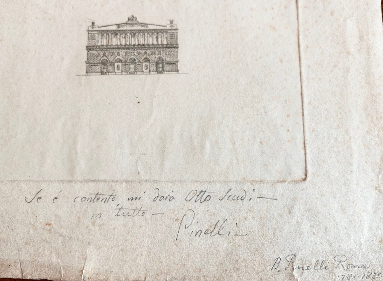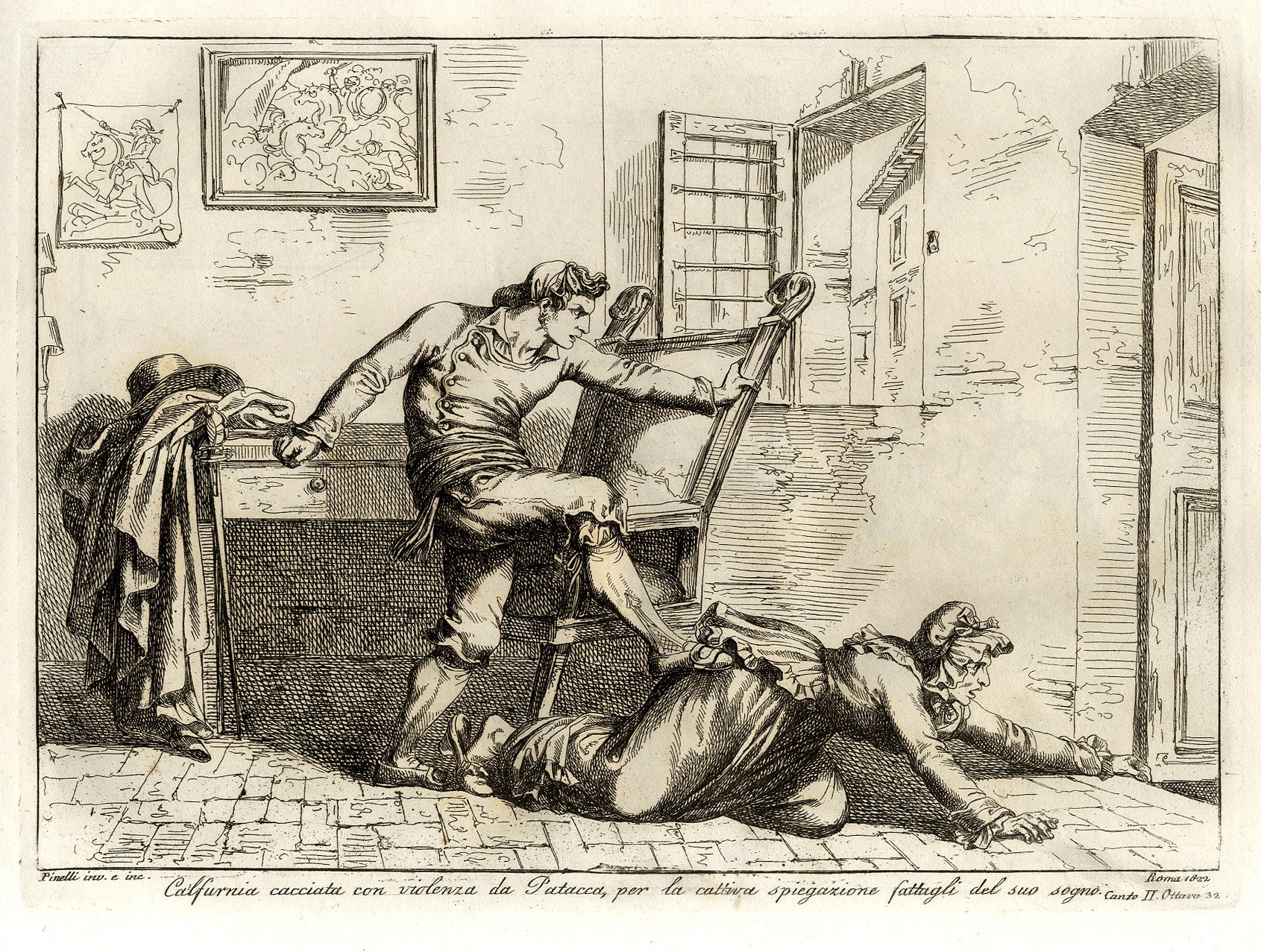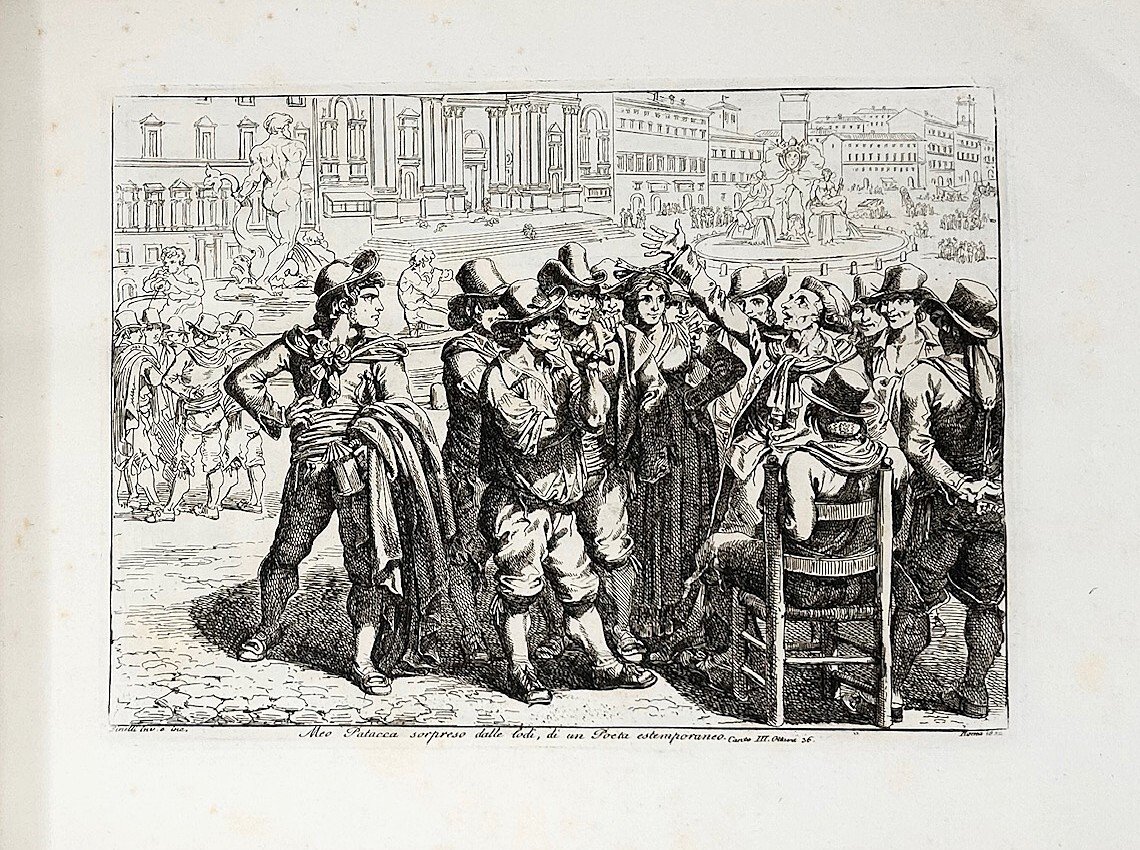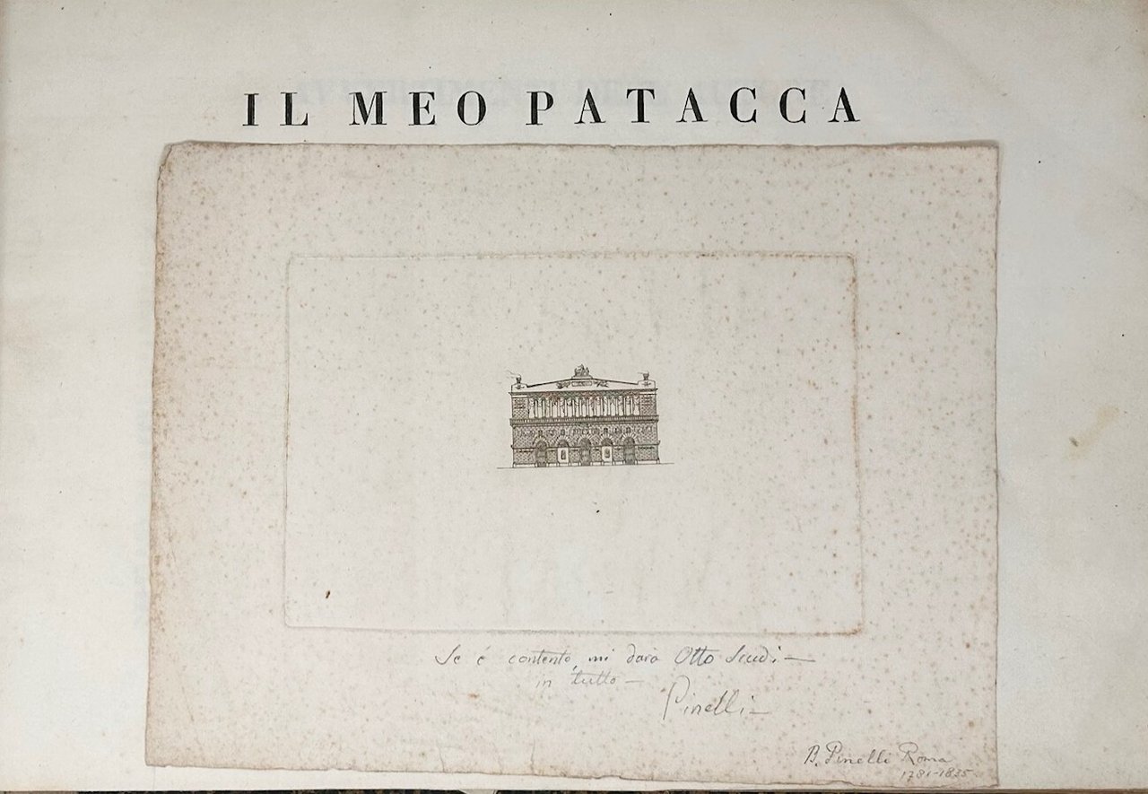 Seconda edizione del poema romanesco di G.Berneri (Roma 1654-1701) scritto nel 1683 per la liberazione di Vienna dall'assedio dei Turchi. Il testo è accompagnato da note filologiche esplicative su vari termini di dialetto romanesco. Prima tiratura dei rami di Pinelli ''strambo e generoso artista che creò il suo capolavoro in quelle illustrazioni del Meo Patacca'' (R.Pacini, Pinelli, pp.25-26). Magnifico e raro album, esemplare, genuino a grandi margini, occasionali fioriture. All'interno del volume è conservata un'incisione originale, raffigurante un palazzo, con annotazione autografa a lapis firmata Pinelli: "Se è contento, mi darà Otto Scudi. Pinelli." Fagiolo-Marini p.311-312. Olschki, Choix, 16448 chef d'oeuvre de Pinelli comme illustrateur''.