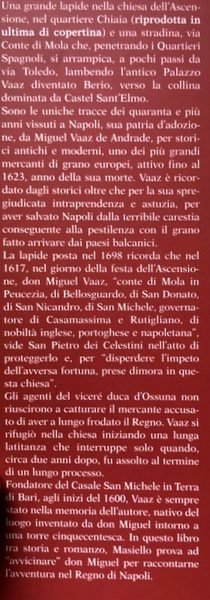 Una grande lapide nella Chiesa dell'Ascensione, nel quartiere Chiaia e una stradina, via Conte di Mola che, penetrando i Quartieri Spagnoli, si arrampica, a pochi passi da via Toledo, lambendo l'antico palazzo Vaaz diventato Berio, verso la collina dominata da Castel Sant'Elmo. Sono le uniche tracce dei quaranta e più anni vissuti a Napoli, sua patria d'adozione, da Miguel Vaaz de Andrade, per storici antichi e moderni, uno dei più grandi mercanti di grano europei, attivo fino al 1623, anno della sua morte. Vaaz è ricordato dagli storici oltre che per la sua spregiudicata intraprendenza e astuzia, per aver salvato Napoli dalla terribile carestia conseguente alla pestilenza con il grano fatto arrivare dai paesi balcanici. La lapide posta nel 1698 ricorda che nel 1617, nel giorno della festa dell'Ascensione, vide san Pietro dei Celestini nell'atto di proteggerlo e, per disperdere l'impeto dell'avversa fortuna, prese dimora in questa Chiesa. Gli agenti del viceré duca d'Ossuna non riuscirono a catturare il mercante accusato di aver a lungo frodato il Regno. Vaaz si rifugiò nella chiesa iniziando una lunga latitanza che interruppe solo quando, circa due anni dopo, fu assolto al termine di un lungo processo. Fondatore del Casale S. Michele in Terra di Bari, agli inizi del 1600, Vaaz è sempre stato nella memoria dell’autore, nativo del luogo inventato da Don Miguel intorno a una torre cinquecentesca. In questo libro tra storia e romanzo, Masiello prova ad “avvicinare” don Miguel per raccontarne l’avventura nel Regno di Napoli.