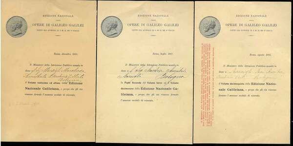 <p>-1907-1909 Tre foglietti 20x14 cm con immagine della medaglia con ritratto di Galileo. Fogli stampati e compilati a mano per accompagnare il dono dell'opera galileiana e chiedere riinviare la ricevuta firmata</p>
