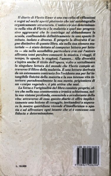 Flavio Emer è un ragazzo che vive in uno spazio diverso: nella sua condizione di assoluta immobilità, il mondo intoccabile in cui vive gli appare come uno scenario teatrale che con la sua immaginazione riesce a trasformare. La sua eccezionale autobiografia arriva ora in libreria grazie a uno speciale computer che gli consente di scrivere con la voce.