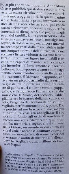 Poco più che venticinquenne, Anna Maria Ortese pubblicò questi due racconti in riviste di scarsa circolazione, dove sono rimasti sino a oggi sepolti. In quelle pagine si è serbata intatta la prima impronta acustica di una voce che avrebbe poi continuato a risuonare, incessante seppure fra intervalli di silenzi, sino alle pagine magistrali del Cardillo. È una voce accorata e dolente, in cui si avverte l’eco di nostalgie mai sopite, di dolcezze negate: ancora una volta, accompagnati dalla mano abile e insieme compassionevole dell’autrice, dalla sua scrittura lirica e visionaria, avremo la ventura di incontrare figure insondabili e arcane ma capaci di manifestare, a chi sappia intenderli, il loro lamento e la loro ribellione. Sono «povere creature inimmaginabili»: come l’ombroso spiritello del primo racconto, il Monaciello appunto, che vive «in un piccolo armadio dalla serratura guasta, dalle porte malferme, fra cataste di panni scuri e penne verdi di pappagallo», e l’enigmatico Fantasma, che altri non è che la Morte, del secondo: «abbagliante era lo sparato della sua camicia di seta, l’argento dei bottoni da polso, il tovagliolo, perfettamente inutile, posato Dio sa perché sul suo braccio sinistro; ma più d’ogni altra cosa era abbagliante il suo sorriso in fondo agli occhi di tenebra». E ancora una volta ritroveremo quel mondo, fra memoria e sogno, che è soltanto della Ortese, un mondo in cui «tutto ciò che si vede o accade è incantato o spaventoso», un mondo fatto di stanze e corridoi e terrazze e anditi di misteriosa bellezza, dove barbaglia, a tratti, il riflesso del mare di Napoli.