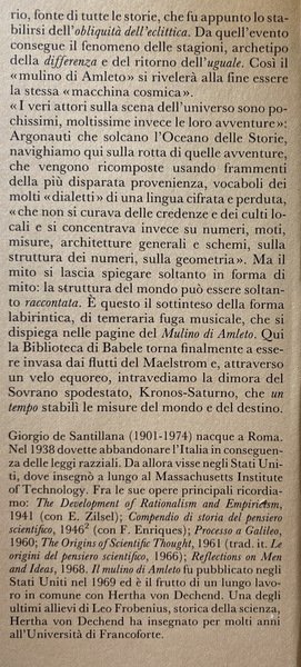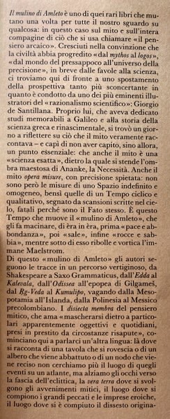 Il mulino di Amleto è uno di quei rari libri che mutano una volta per tutte il nostro sguardo su qualcosa: in questo caso sul mito e sull'intera compagine di ciò che si usa chiamare «il pensiero arcaico». Cresciuti nella convinzione che la civiltà abbia progredito «dal mythos al logos», «dal mondo del pressappoco all'universo della precisione», in breve dalle favole alla scienza, ci troviamo qui di fronte a uno spostamento della prospettiva tanto più sconcertante in quanto è condotto da uno dei più eminenti illustratori del «razionalismo scientifico»: Giorgio de Santillana.