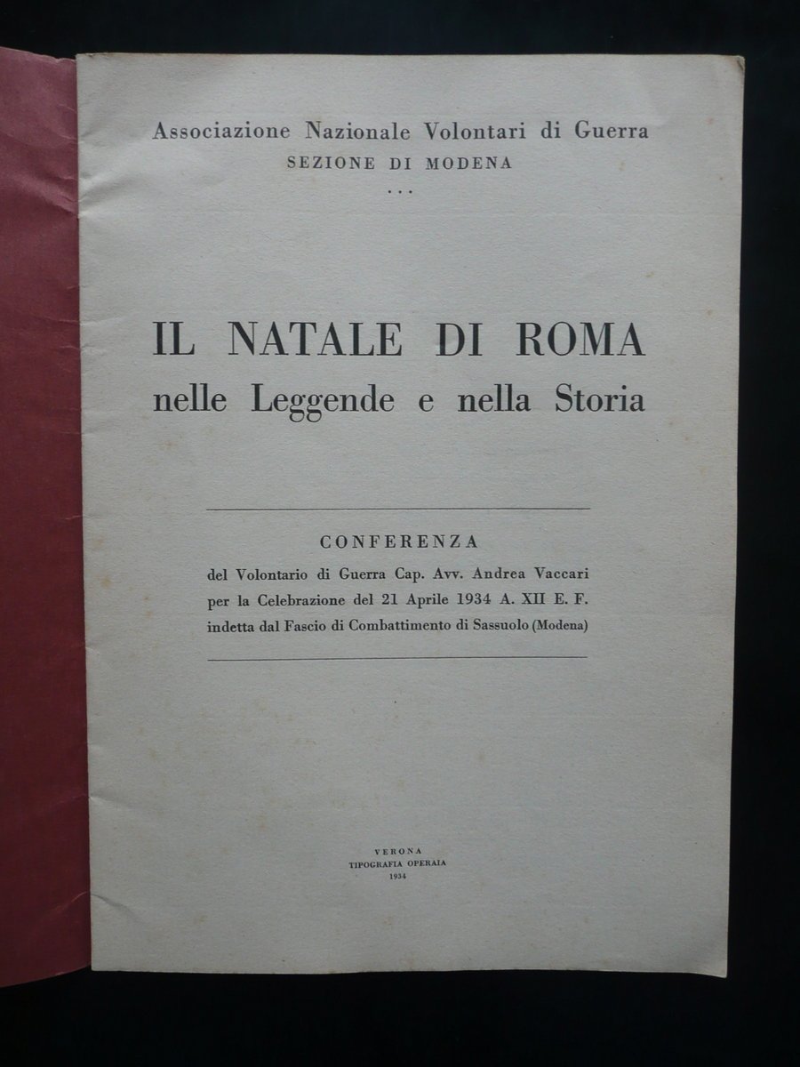 Opuscolo, Associazione Nazionale Volontari di Guerra Sezione di Modena - Il Natale di Roma nelle Leggende e nella Storia Conferenza del volontario di Guerra Cap. Avv. Andrea Vaccari per la Celebrazione del 21 Aprile 1934, indetta dal Fascio di Combattimento di Sassuolo (Modena) Tipografia Operaia, Verona 1934, cm 24x17, pp. 18, brossura ed. Condizioni di conservazione Esemplare in buone condizioni con tracce d'uso, lievemente ondulato; brossure con qualche piccola leggerissima abrasione. Interni buoni. SC03.D9988 N