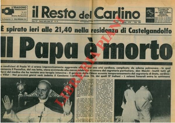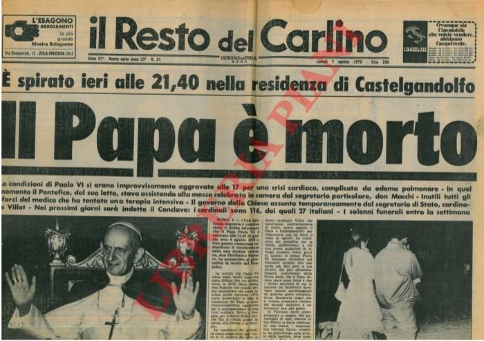 Bologna, 1978, agosto 7, titolo a tutta pagina del "Resto del Carlino", nel giornale completo.