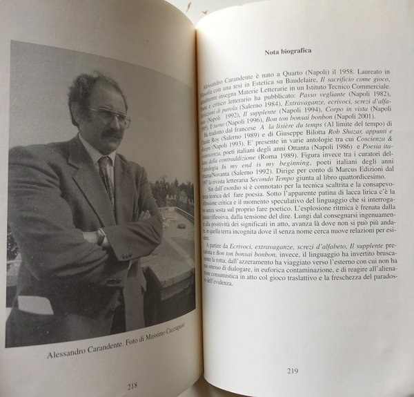 Alessandro Carandente è nato a Quarto (Napoli) il 1958. Laureato in Filosofia con una tesi in Estetica su Baudelaire, Il sacrificio come gioco. Poeta e critico letterario ha pubblicato: Passo vegliante (Napoli 1982), Variazioni di parola (Salerno 1984), Extravaganze, ecrivoci, screzi d'alfabeto (Napoli 1992), Il supplente (Napoli 1994), Corpo in vista (Napoli 1995), Il turno (Napoli 1996), Bon ton bonsai bonbon (Napoli 2001) Specchio d’oblio (Bollate-Milano, 2001) Il paradosso dell’evidenza (Napoli 2002).